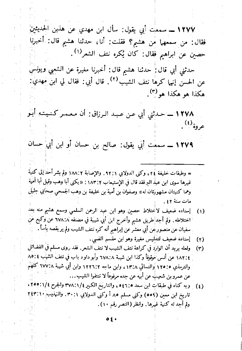 1277 - سَمِعت أبي يَقُول سَأَلَ بن مهْدي عَن هذَيْن الْحَدِيثين فَقَالَ من سمعهما من هشيم فَقلت أَنا حَدثنَا هشيم قَالَ أخبرنَا حُصَيْن عَن إِبْرَاهِيم فَقَالَ كَانَ يكره نتف الشّعْر حَدثنِي أَبِي قَالَ حَدَّثَنَا هُشَيْمٌ قَالَ أخبرنَا مُغيرَة عَن الشّعبِيّ وَيُونُس عَن الْحسن إنَّهُمَا كرها نتف الشيب قَالَ أبي فَقَالَ لي بن مهْدي هَكَذَا هُوَ هَكَذَا هُوَ
