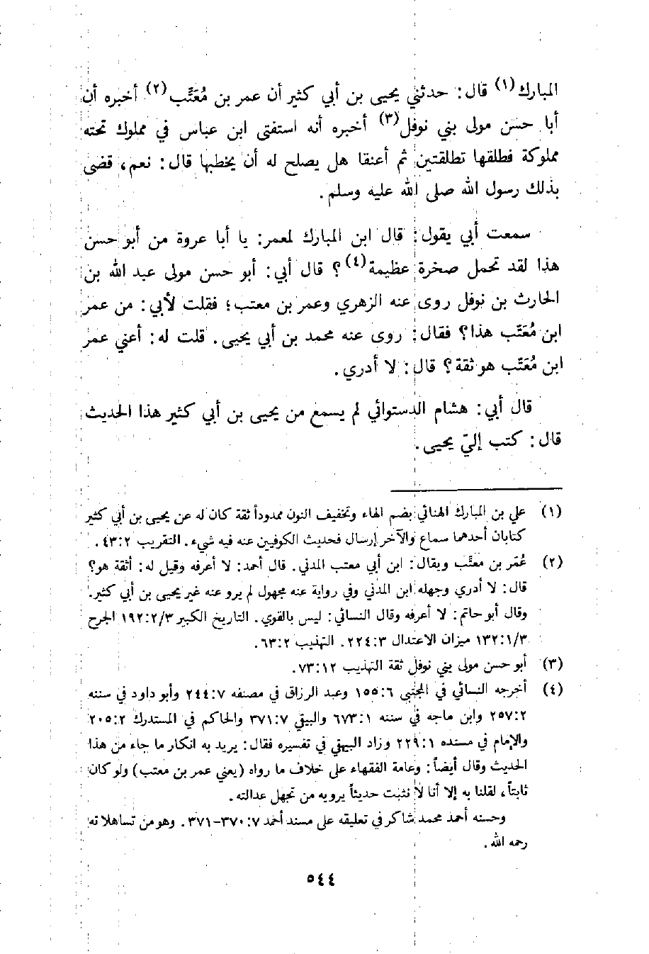بْنِ الْمُبَارَكِ قَالَ حَدَّثَنِي يَحْيَى بْنُ أَبِي كَثِيرٍ أَنَّ عُمَرَ بْنَ مُعَتِّبٍ أَخْبَرَهُ أَنَّ أَبَا حَسَنٍ مَوْلَى بَنِي نَوْفَلٍ أَخْبَرَهُ أَنه استفتى بن عَبَّاسٍ فِي مَمْلُوكٍ تَحْتَهُ مَمْلُوكَةٌ فَطلقهَا تطلقتين ثمَّ أعنقا هَلْ يَصْلُحُ لَهُ أَنْ يَخْطُبَهَا قَالَ نَعَمْ قَضَى بِذَلِكَ رَسُولُ اللَّهِ صَلَّى اللَّهُ عَلَيْهِ وَسَلَّمَ سَمِعت أبي يَقُول قَالَ بن الْمُبَارك لمعمر يَا أَبَا عُرْوَة من أَبُو حسن هَذَا لقد تحمل صَخْرَة عَظِيمَة قَالَ أبي أَبُو حسن مولى عبد الله بن الْحَارِث بن نَوْفَل روى عَنهُ الزُّهْرِيّ وَعمر بن معتب فَقلت لأبي من عمر بن معتب هَذَا فَقَالَ روى عَنهُ مُحَمَّد بن أبي يحيى قلت لَهُ أَعنِي عمر بن معتب هُوَ ثِقَة قَالَ لَا أَدْرِي قَالَ أبي هِشَام الدستوَائي لم يسمع من يحيى بن أبي كثير هَذَا الحَدِيث قَالَ كتب إِلَيّ يحيى