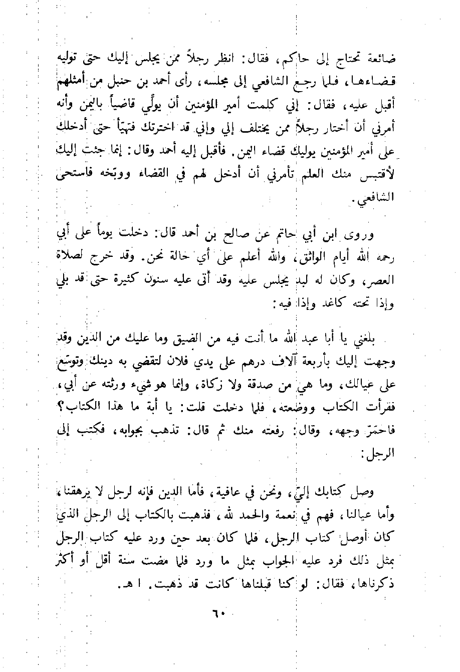 ضائعة تحتاج إلى حاكم، فقال: انظر رجلا ممن يجلس إليك حتى توليه قضاءها، فلما رجع الشافعي إلى مجلسه، رأى أحمد بن حنبل من أمثلهم أقبل عليه، فقال: إني كلمت أمير المؤمنين أن يولي قاضيا بالمين وأنه أمرني أن أختار رجلا ممن يختلف إلي وإني قد اخترتك فتهيأ حتى أدخلك على أمير المؤمنين يوليك قضاء اليمن.