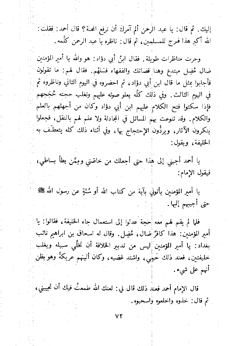 ثم قال: يا عبد الرحمن ألم آمرك أن ترفع المحنة؟ قال أحمد: فقلت: الله أكبر هذا فرج للمسلمين، ثم قال: ناظره يا عبد الرحمن كلمه.