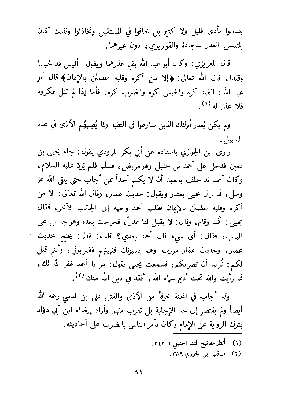 قال المقريزي: وكان أبو عبد الله يقيم عذرهما ويقول: أليس قد حبسا وقيدا، قال الله تعالى: (إلا من أكره وقبله مطمئن بالايمان) قال أبو عبد الله: القيد كره والحبس كره والضرب كره، فأما إذا لم تنل بمكروه فلا عذر له (1) .