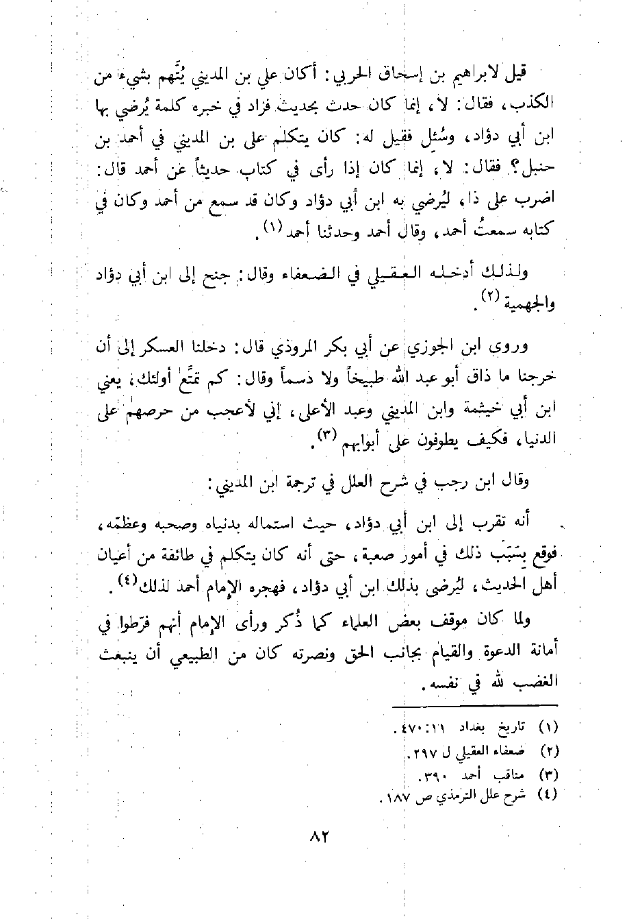 قيل لابراهيم بن إسحاق الحربي: أكان علي بن المديني يتهم بشئ من الكذب، فقال: لا، إنما كان حدث بحديث فزاد في خبره كلمة يرضي بها ابن أبي دؤاد، وسئل فقيل له: كان يتكلم على بن المديني في أحمد بن حنبل؟ فقال: لا، إنما كان إذا رأى في كتاب حديثا عن أحمد قال: اضرب على ذا، ليرضي به ابن أبي دؤاد وكان قد سمع من أحمد وكان في كتابه سمعت أحمد، وقال أحمد وحدثنا أحمد (1) .