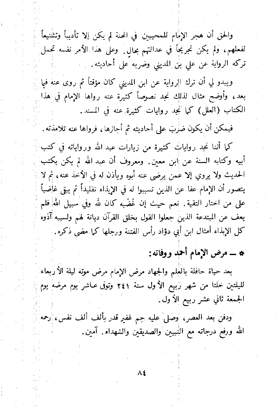 * - مرض الامام أحمد ووفاته: بعد حياة حافة بالعلم والجهاد مرض الامام مرض موته ليلة الاربعاء لليلتين خلتا من شهر ربيع الاول سنة 241 وتوفى عاشر يوم مرضه يوم الجمعة ثاني عشر ربيع الاول.