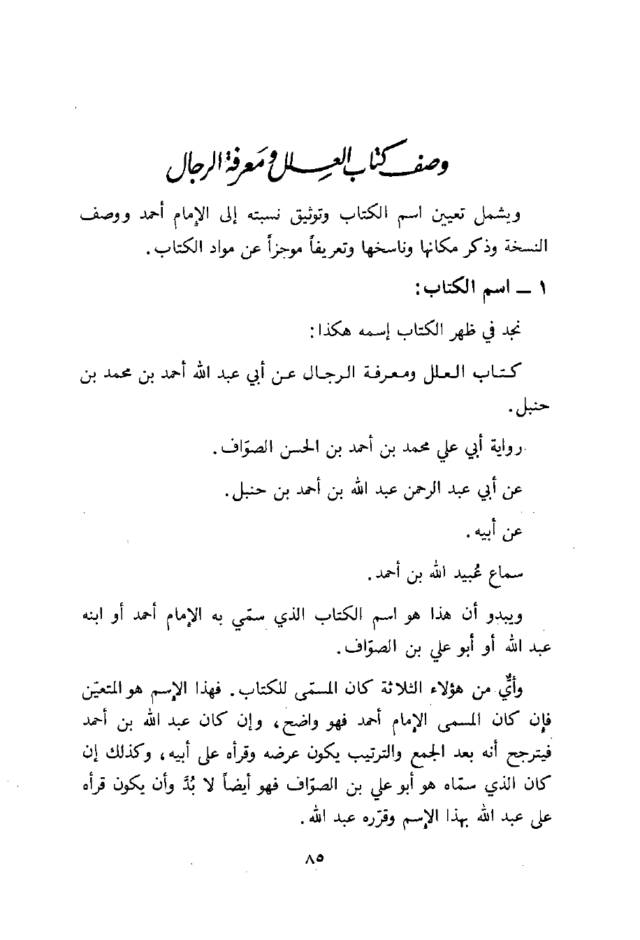 ويشمل تعيين اسم الكتاب وتوثيق نسبته إلى الامام أحمد ووصف النسخة وذكر مكانها وناسخها وتعريفا موجزا عن مواد الكتاب.