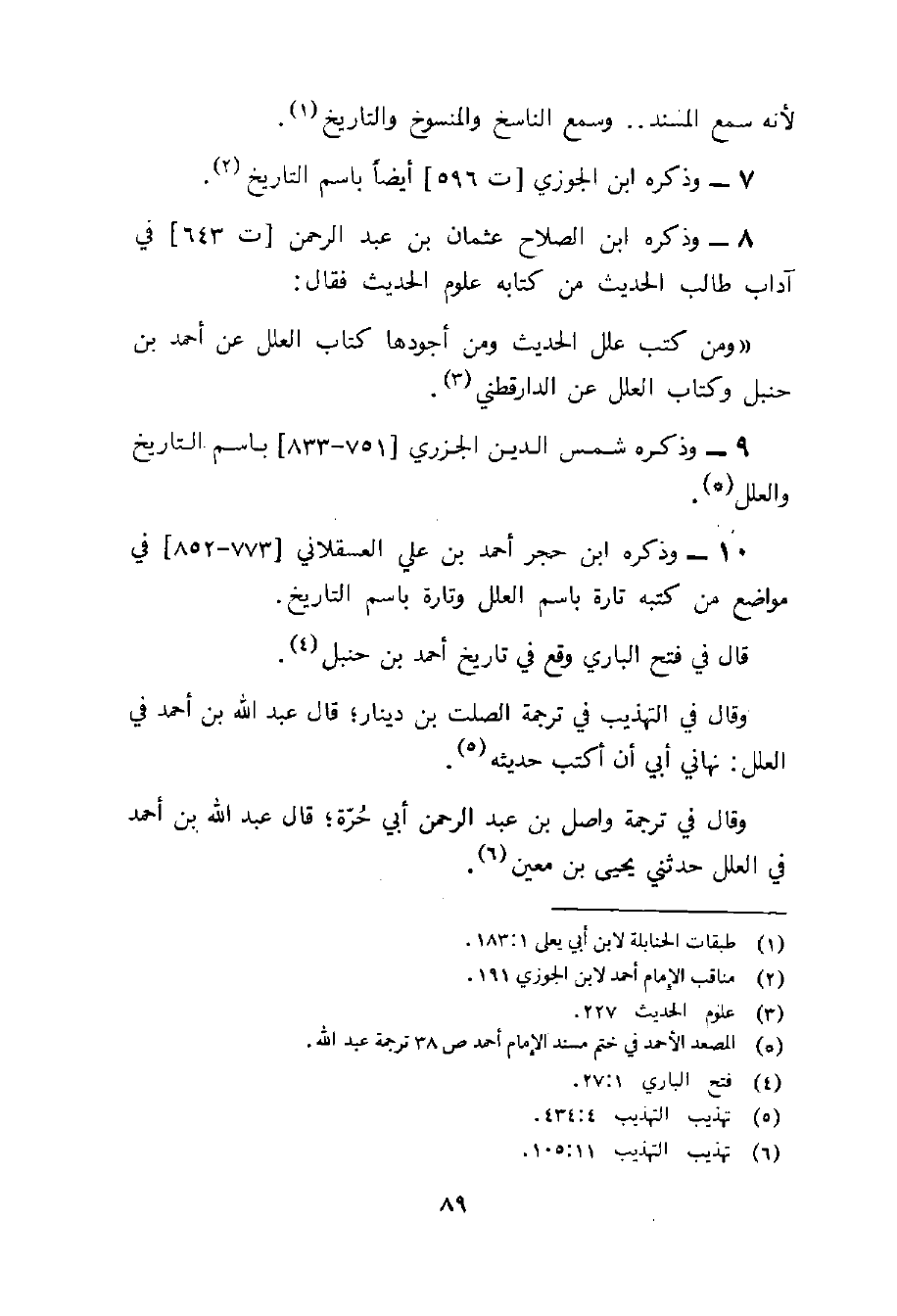 8 - وذكره ابن الصلاح عثمان بن عبد الرحمن (ت 643) في آداب طالب الحديث من كتابه علوم الحديث فقال: " ومن كتاب علل الحديث ومن أجودها كتاب العلل عن أحمد بن حنبل وكتاب العلل عن الدارقطني (3) .