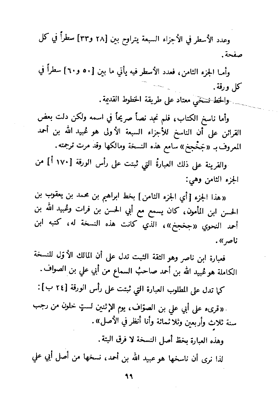 والقرينة على ذلك العبارة التي ثبتت على رأس الورقة (170 أ) من الجزء الثامن وهي: " هذا الجزء (أي الجزء الثاني) بخط ابراهيم بن محمد بن يعقوب بن الحسن ابن المأمون، كان يسمع مع أبي الحسن بن فرات وعبيد الله بن أحمد النحوي " جخجخ "، الذي كانت هذه النسخة له، كتبه ابن ناصر ".