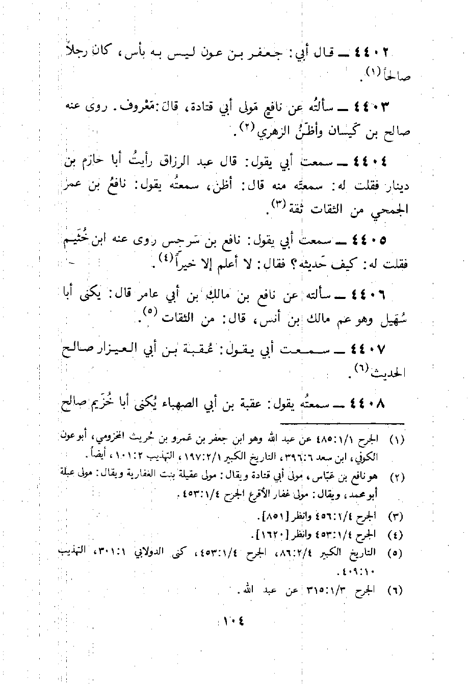 4404 - سَمِعت أبي يَقُول قَالَ عبد الرَّزَّاق رَأَيْت أَبَا حَازِم بن دِينَار فَقلت لَهُ سمعته مِنْهُ قَالَ أَظن سمعته يَقُول نَافِع بن عمر الجُمَحِي من الثِّقَات ثِقَة
