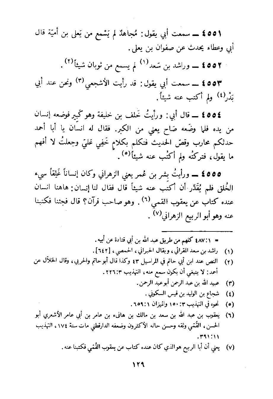 4555 - وَرَأَيْت بشر بن عمر يَعْنِي الزهْرَانِي وَكَانَ إنْسَانا غلقا سيء الْخلق فَلم يقدر أَن أكتب عَنهُ شَيْء قَالَ فَقَالَ لنا انسان هَهُنَا إِنْسَان عِنْده كتاب عَن يَعْقُوب القمي وَهُوَ صَاحب قُرْآن قَالَ فَجِئْنَا فكتبنا عَنهُ وَهُوَ أَبُو ربيع الزهْرَانِي
