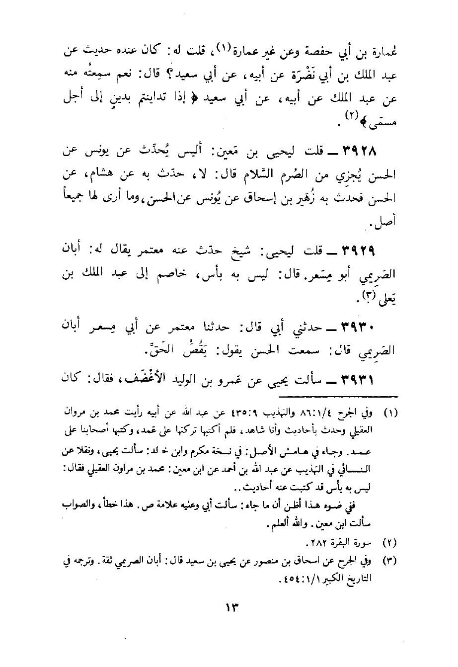 3928 - قلت ليحيى بن معِين أَلَيْسَ يحدث عَن يُونُس عَن الْحسن يَجْزِي من الصرم السَّلَام قَالَ لَا حدث بِهِ عَن هِشَام عَن الْحسن فَحدث بِهِ زُهَيْر بن إِسْحَاق عَن يُونُس عَن الْحسن وَمَا أرى لَهَا جَمِيعًا أصل