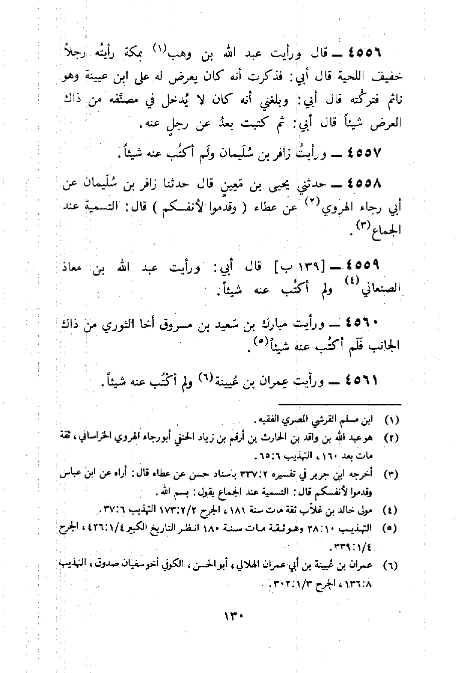 4556 - قَالَ وَرَأَيْت عبد الله بن وهب بِمَكَّة رَأَيْته رجلا خَفِيف اللِّحْيَة قَالَ أبي فَذكرت أَنه كَانَ يعرض لَهُ على بن عُيَيْنَة وَهُوَ نَائِم فتركته قَالَ أبي وَبَلغنِي أَنه كَانَ لَا يدْخل فِي مُصَنفه من ذَاك الْعرض شَيْئا قَالَ أبي ثمَّ كتبت بعد عَن رجل عَنهُ