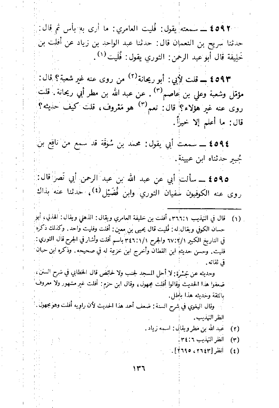 4592 - سمعته يَقُول فليت العامري مَا أرى بِهِ بَأْس ثمَّ قَالَ حَدثنَا سريح بن النُّعْمَان قَالَ حَدثنَا عبد الْوَاحِد بن زِيَاد عَن أفلت بن خَليفَة قَالَ أَبُو عبد الرَّحْمَن الثَّوْريّ يَقُول فليت
