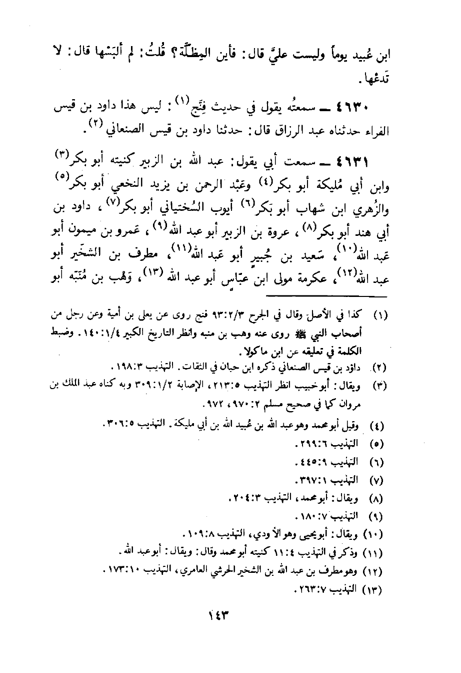 4631 - سَمِعت أبي يَقُول عبد الله بن الزبير كنيته أَبُو بكر وَابْن أبي مليكَة أَبُو بكر وَعبد الرَّحْمَن بن يزِيد النَّخعِيّ أَبُو بكر وَالزهْرِيّ بن شهَاب أَبُو بكر أَيُّوب السّخْتِيَانِيّ أَبُو بكر دَاوُد بن أبي هِنْد أَبُو بكر عُرْوَة بن الزبير أَبُو عبد الله عَمْرو بن مَيْمُون أَبُو عبد الله سعيد بن جُبَير أَبُو عبد الله مطرف بن الشخير أَبُو عبد الله عِكْرِمَة مولى بن عَبَّاس أَبُو عبد الله وهب بن مُنَبّه أَبُو عبد الله عَمْرو بن مرّة أَبُو عبد الله يُونُس بن عبيد أَبُو عبد الله