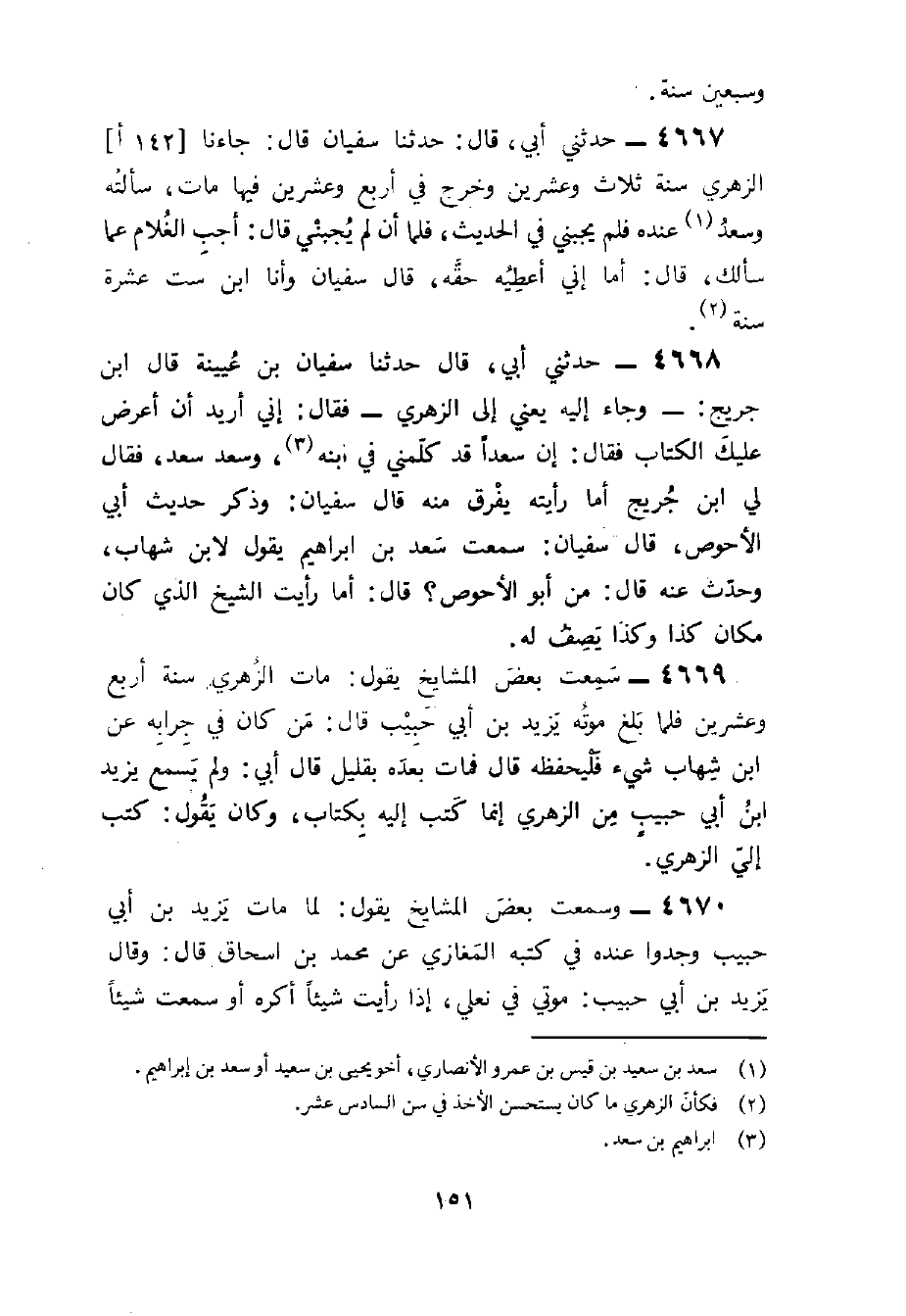 4668 - حَدثنِي أبي قَالَ حَدَّثَنَا سُفْيَانُ بْنُ عُيَيْنَةَ قَالَ بن جريج وَجَاء إِلَيْهِ يَعْنِي إِلَى الزُّهْرِيّ فَقَالَ إِنِّي أُرِيد أَن أعرض عَلَيْك الْكتاب فَقَالَ إِن سَعْدا قد كلمني فِي ابْنه وَسعد سعد فَقَالَ لي بن جريج أما رَأَيْته يفرق مِنْهُ قَالَ سُفْيَان وَذكر حَدِيث أبي الْأَحْوَص قَالَ سُفْيَان سَمِعت سعد بن إِبْرَاهِيم يَقُول لِابْنِ شهَاب وَحدث عَنهُ قَالَ من أَبُو الْأَحْوَص قَالَ أما رَأَيْت الشَّيْخ الَّذِي كَانَ مَكَان كَذَا وَكَذَا يصف لَهُ