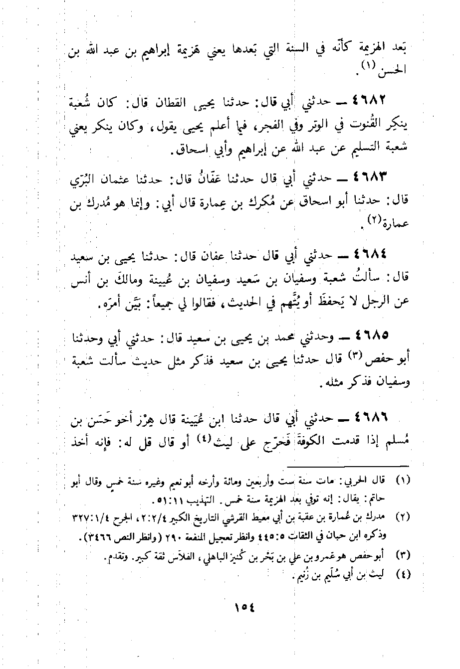 4682 - حَدثنِي أبي قَالَ حَدثنَا يحيى الْقطَّان قَالَ كَانَ شُعْبَة يُنكر الْقُنُوت فِي الْوتر وَفِي الْفجْر فِيمَا أعلم يحيى يَقُول وَكَانَ يُنكر يَعْنِي شُعْبَة التَّسْلِيم عَن عبد الله عَن إِبْرَاهِيم وَأبي إِسْحَاق