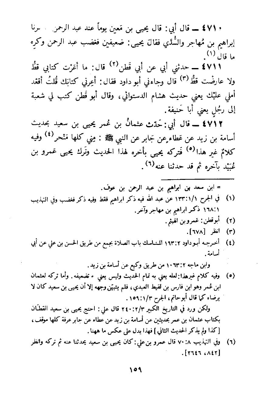 4710 - قَالَ أبي قَالَ يحيى بن معِين يَوْمًا عِنْد عبد الرَّحْمَن وَذكرنَا إِبْرَاهِيم بن مهَاجر وَالسُّديّ فَقَالَ يحيى ضعيفين فَغَضب عبد الرَّحْمَن وَكره مَا قَالَ