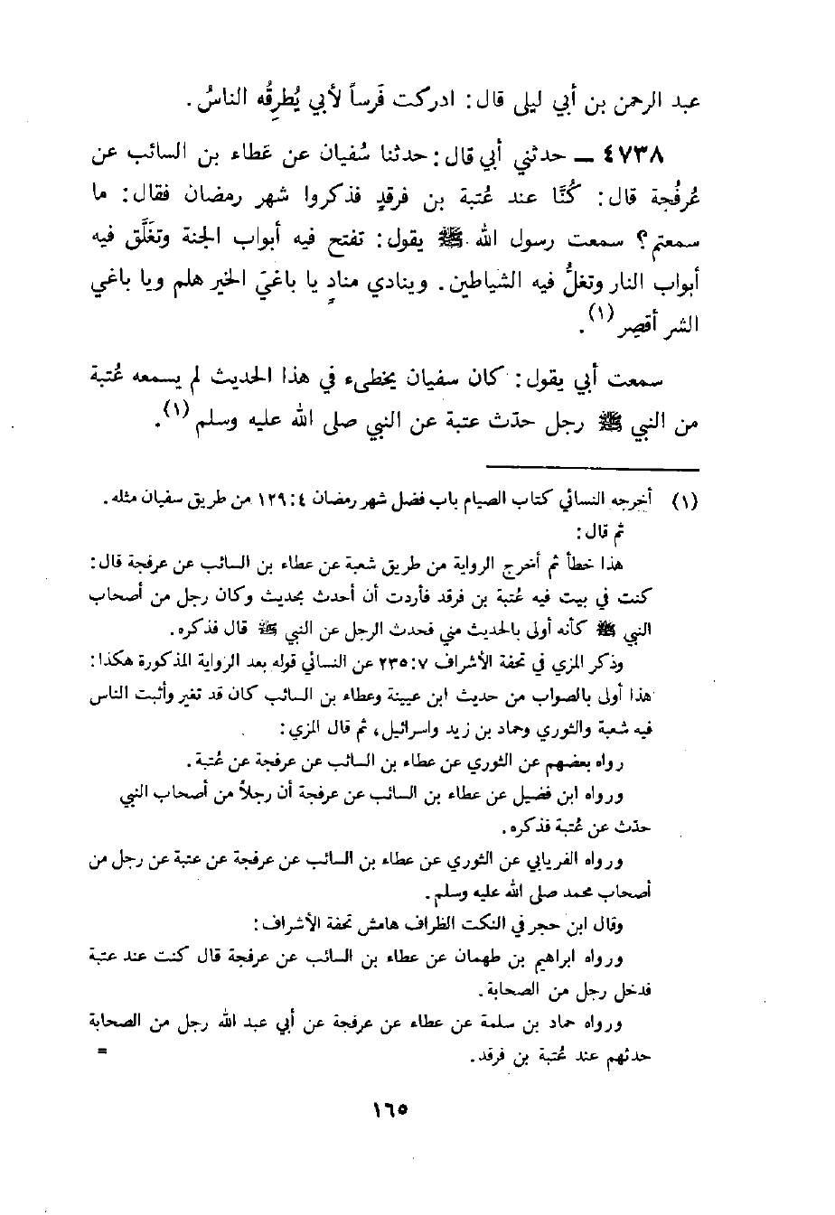 4738 - حَدثنِي أبي قَالَ حَدثنَا سُفْيَان عَن عَطاء بن السَّائِبِ عَنْ عَرْفَجَةَ قَالَ كُنَّا عِنْدَ عُتْبَةَ بْنِ فَرْقَدٍ فَذَكَرُوا شَهْرَ رَمَضَانَ فَقَالَ مَا سَمِعْتُمْ سَمِعْتُ رَسُولَ اللَّهِ صَلَّى اللَّهُ عَلَيْهِ وَسَلَّمَ يَقُولُ تُفَتَّحُ فِيهِ أَبْوَابُ الْجَنَّةِ وَتُغَلَّقُ فِيهِ أَبْوَابُ النَّارِ وَتُغَلُّ فِيهِ الشَّيَاطِينُ وَيُنَادِي مُنَادٍ يَا بَاغِيَ الْخَيْرِ هَلُمَّ وَيَا بَاغِيَ الشِّرِّ أَقْصِرْ سَمِعْتُ أبي يَقُول كَانَ سُفْيَان يخطىء فِي هَذَا الْحَدِيثِ لَمْ يَسْمَعْهُ عُتْبَةُ مِنَ النَّبِيِّ صَلَّى اللَّهُ عَلَيْهِ وَسَلَّمَ رَجُلٌ حَدَّثَ عُتْبَةَ عَنِ النَّبِيِّ صَلَّى اللَّهُ عَلَيْهِ وَسَلَّمَ
