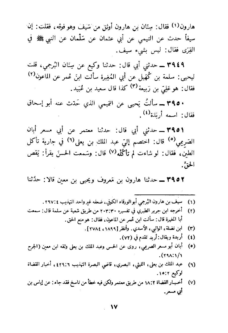 3949 - حَدَّثَنِي أَبِي قَالَ حَدَّثَنَا وَكِيعٌ عَنْ سِنَان البرجمي قلت ليحيى سَلمَة بْن كهيل عَن أَبِي الْمُغيرَة سَأَلت بن عمر عَن الماعون فَقَالَ هُوَ عَليّ بن ربيعَة كَذَا قَالَ سعيد بن عبيد