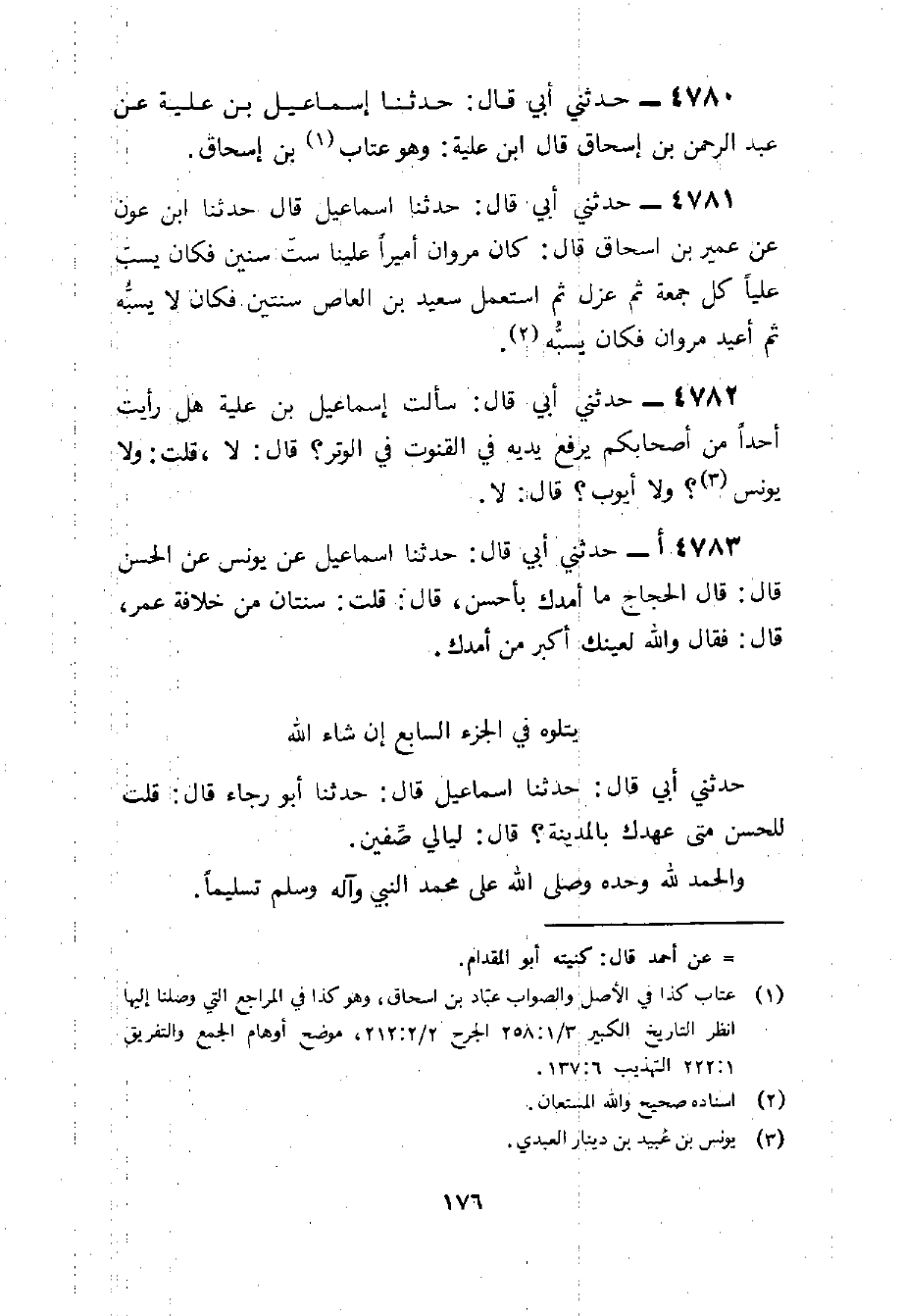 يتلوه فِي الْجُزْء السَّابِع إِن شَاءَ الله حَدثنِي أبي قَالَ حَدثنَا إِسْمَاعِيل قَالَ حَدثنَا أَبُو رَجَاء قَالَ قلت لِلْحسنِ متي عَهْدك بِالْمَدِينَةِ قَالَ ليَالِي صفّين وَالْحَمْد لله وَحده وَصلى الله على مُحَمَّد النَّبِي وَآله وَسلم تَسْلِيمًا