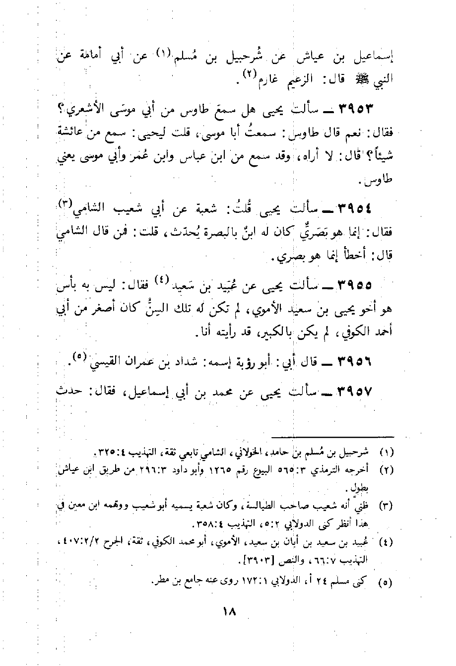 3953 - سَأَلْتُ يَحْيَى هَلْ سَمِعَ طَاوُسٌ مِنْ أَبِي مُوسَى الْأَشْعَرِيِّ فَقَالَ نَعَمْ قَالَ طَاوُسٌ سَمِعْتُ أَبَا مُوسَى قُلْتُ لِيَحْيَى سَمِعَ مِنْ عَائِشَةَ شَيْئًا قَالَ لَا أَرَاهُ وَقد سمع من بن عَبَّاسٍ وَابْنِ عُمَرَ وَأَبِي مُوسَى يَعْنِي طَاوس