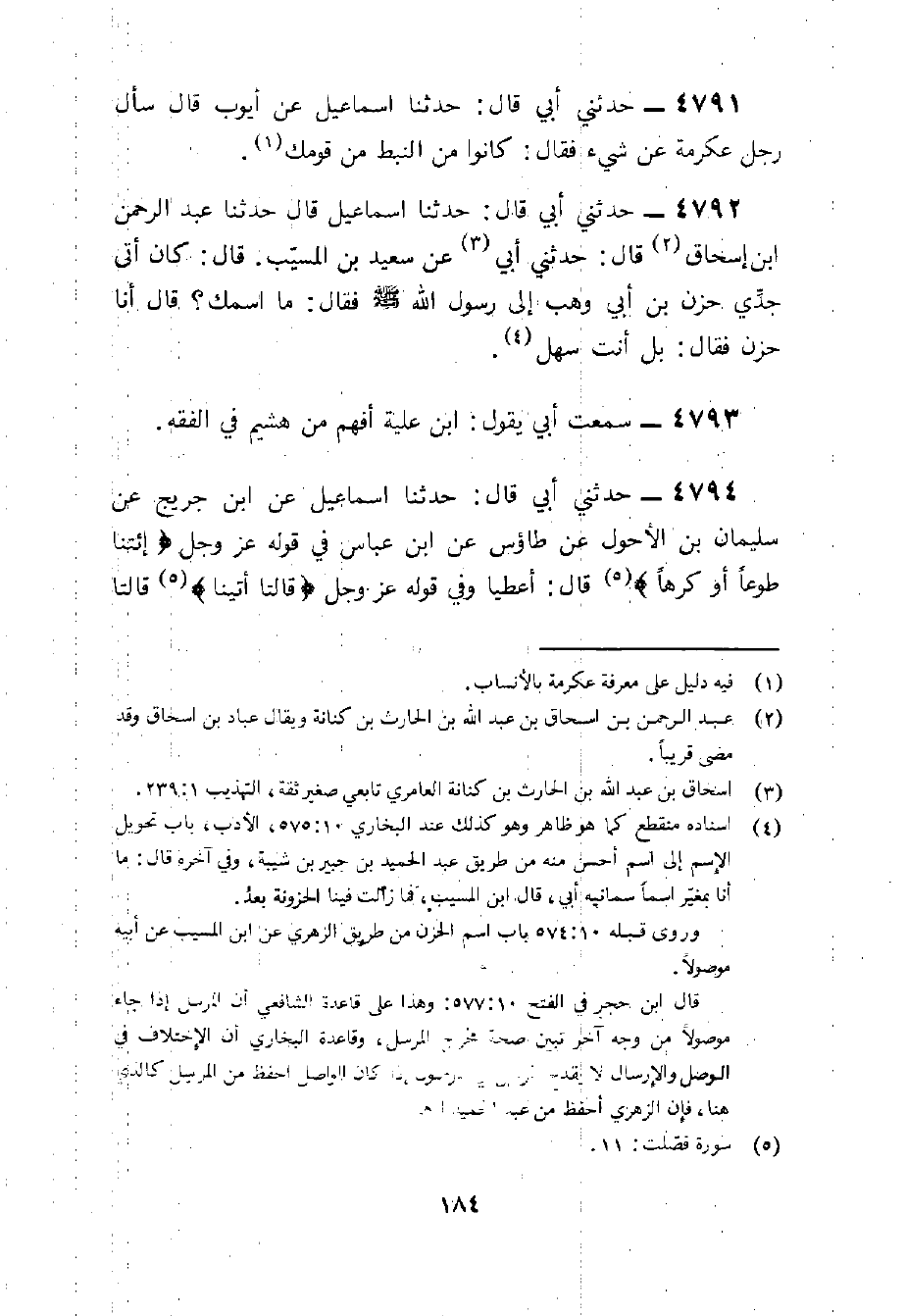 4791 - حَدثنِي أبي قَالَ حَدثنَا إِسْمَاعِيل عَن أَيُّوب قَالَ سَأَلَ رجل عِكْرِمَة عَن شَيْء فَقَالَ كَانُوا من النبط من قَوْمك