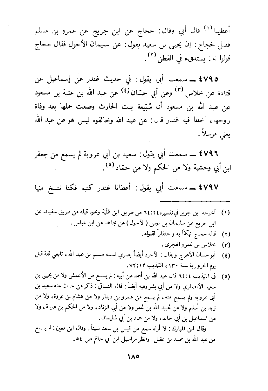 4797 - سَمِعت أبي يَقُول أَعْطَانَا غنْدر كتبه فَكُنَّا ننسخ مِنْهَا وَكَانَ يقْرَأ علينا كثيرا حَتَّى أَي نمل إِلَّا حَدِيث سعيد بِبَغْدَاد نسخناها بِبَغْدَاد