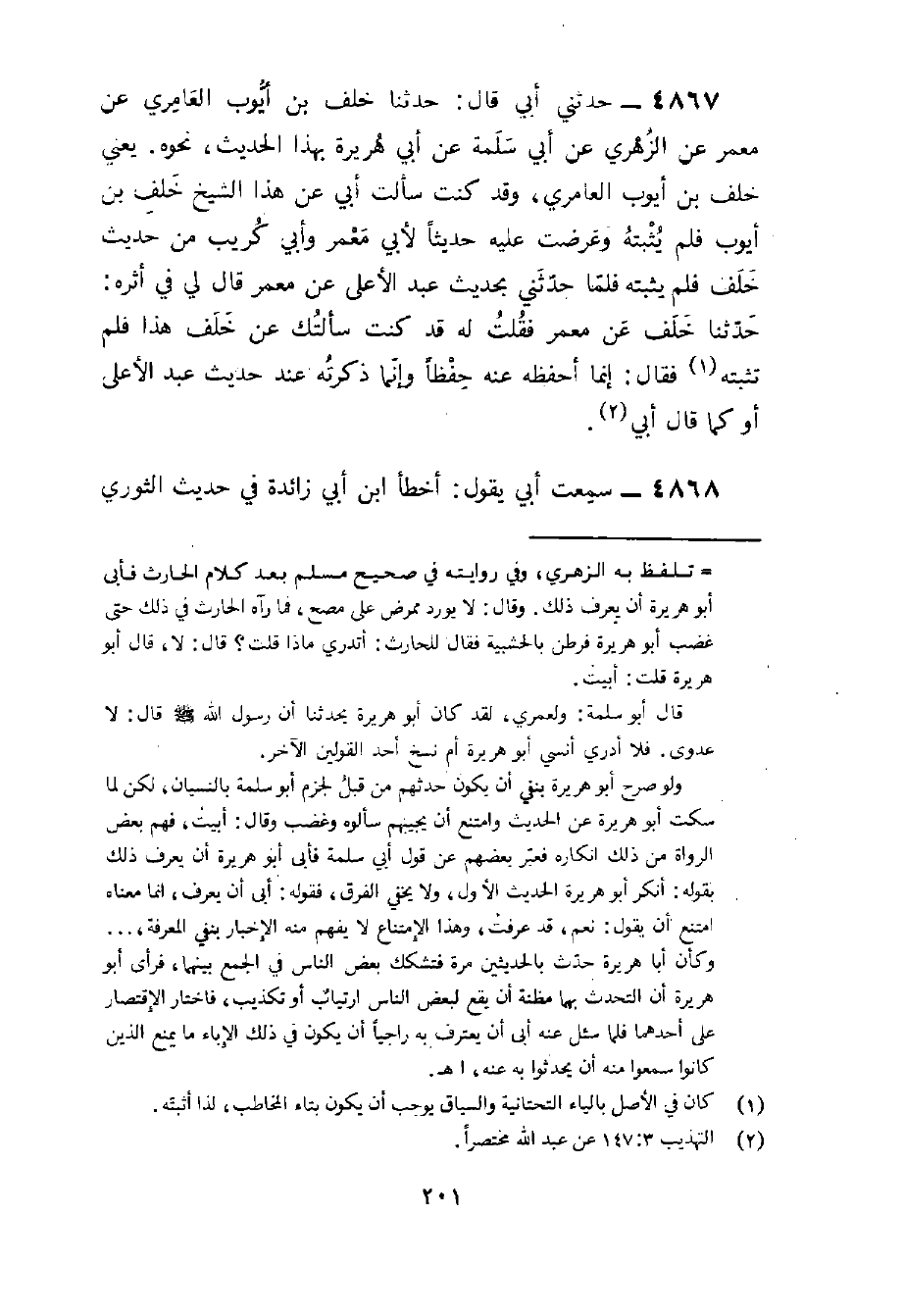 4867 - حَدثنِي أبي قَالَ حَدثنَا خَلَفُ بْنُ أَيُّوبَ الْعَامِرِيُّ عَنْ مَعْمَرٍ عَنِ الزُّهْرِيِّ عَنْ أَبِي سَلَمَةَ عَنْ أَبِي هُرَيْرَةَ بِهَذَا الْحَدِيثِ نَحْوَهُ يَعْنِي خَلَفَ بْنَ أَيُّوبَ الْعَامِرِيَّ وَقَدْ كُنْتُ سَأَلْتُ أَبِي عَنْ هَذَا الشَّيْخِ خَلَفِ بْنِ أَيُّوبَ فَلَمْ يُثبتهُ وَعرضت عَلَيْهِ حَدِيثا لأبي معمر وَأبي كريب من حَدِيث خلف فَلم يُثبتهُ فَلَمَّا حَدثنِي بِحَدِيث عبد الْأَعْلَى عَن معمر قَالَ لي فِي أَثَره حَدثنَا خلف عَن معمر فَقلت لَهُ قد كنت سَأَلتك عَن خلف هَذَا فَلم تثبته فَقَالَ إِنَّمَا أحفظه عَنهُ حفظا وَإِنَّمَا ذكرته عِنْد حَدِيث عبد الْأَعْلَى أَو كَمَا قَالَ أَبِي