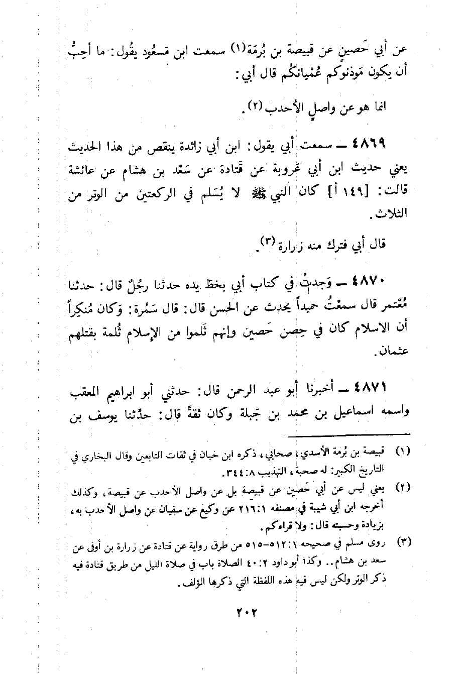 4869 - سَمِعت أبي يَقُول بن أَبِي زَائِدَةَ يَنْقُصُ مِنْ هَذَا الحَدِيث يَعْنِي حَدِيث بْنُ أَبِي عَرُوبَةَ عَنْ قَتَادَةَ عَنْ سَعْدِ بْنِ هِشَامٍ عَنْ عَائِشَةَ قَالَتْ كَانَ النَّبِيُّ صَلَّى اللَّهُ عَلَيْهِ وَسَلَّمَ لَا يُسَلِّمُ فِي الرَّكْعَتَيْنِ مِنَ الْوِتْرِ مِنَ الثَّلَاث قَالَ أبي فَترك مِنْهُ زُرَارَةَ