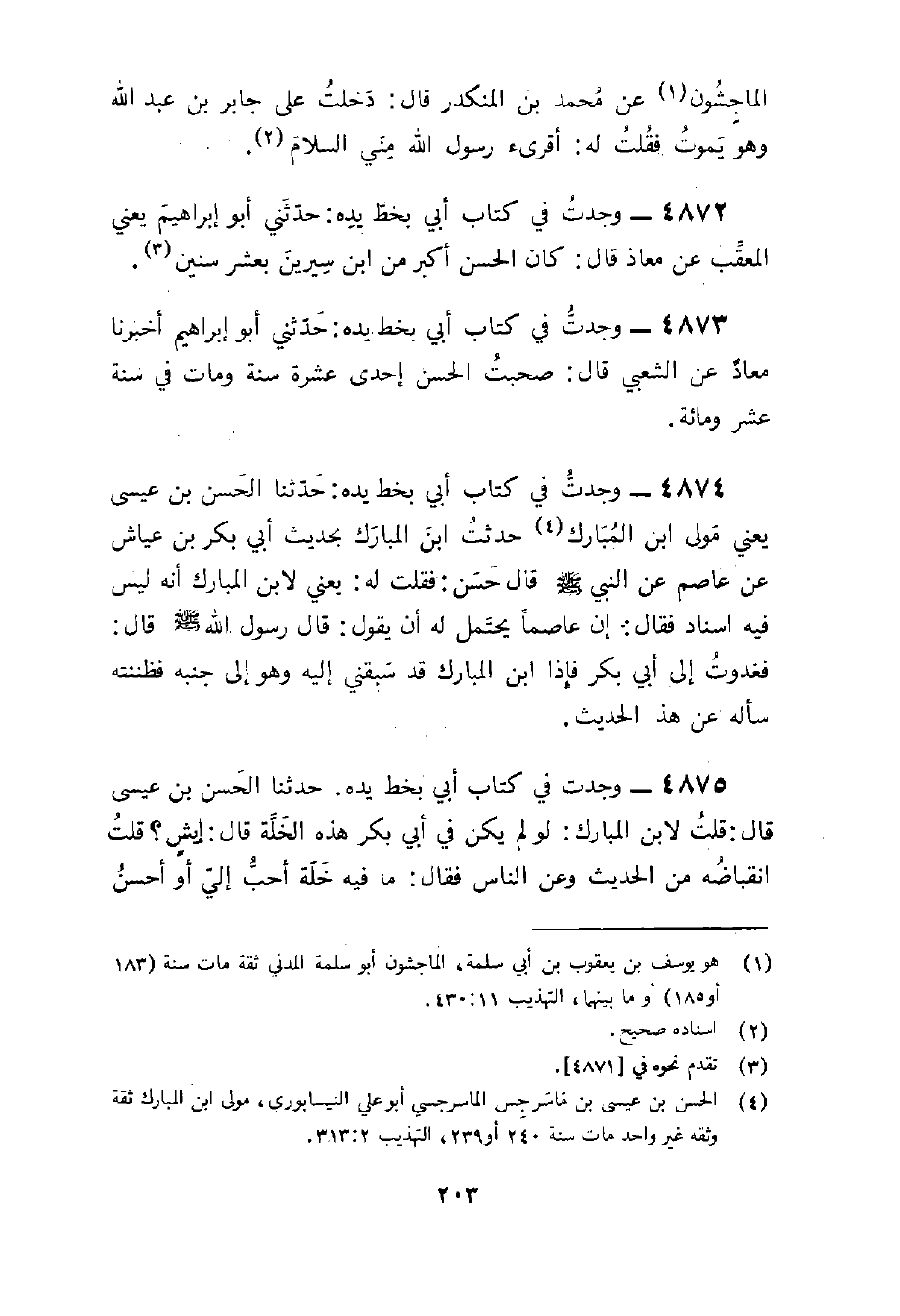 4874 - وجدت فِي كتاب أبي بِخَط يَده حَدثنَا الْحسن بن عِيسَى يَعْنِي مولى بن الْمُبَارك حدثت بن الْمُبَارك بِحَدِيث أبي بكر بْن عَيَّاش عَن عَاصِم عَن النَّبِي صلى الله عَلَيْهِ وَسلم قَالَ حسن فَقلت لَهُ يَعْنِي لِابْنِ الْمُبَارك إِنَّه لَيْسَ فِيهِ إِسْنَاد فَقَالَ إِن عَاصِمًا يحْتَمل لَهُ أَن يَقُول قَالَ رَسُولُ اللَّهِ صَلَّى اللَّهُ عَلَيْهِ وَسلم قَالَ فَغَدَوْت إِلَى أبي بكر فَإِذا بن الْمُبَارك قد سبقني إِلَيْهِ وَهُوَ إِلَى جنبه فظننته سَأَلَهُ عَن هَذَا الحَدِيث
