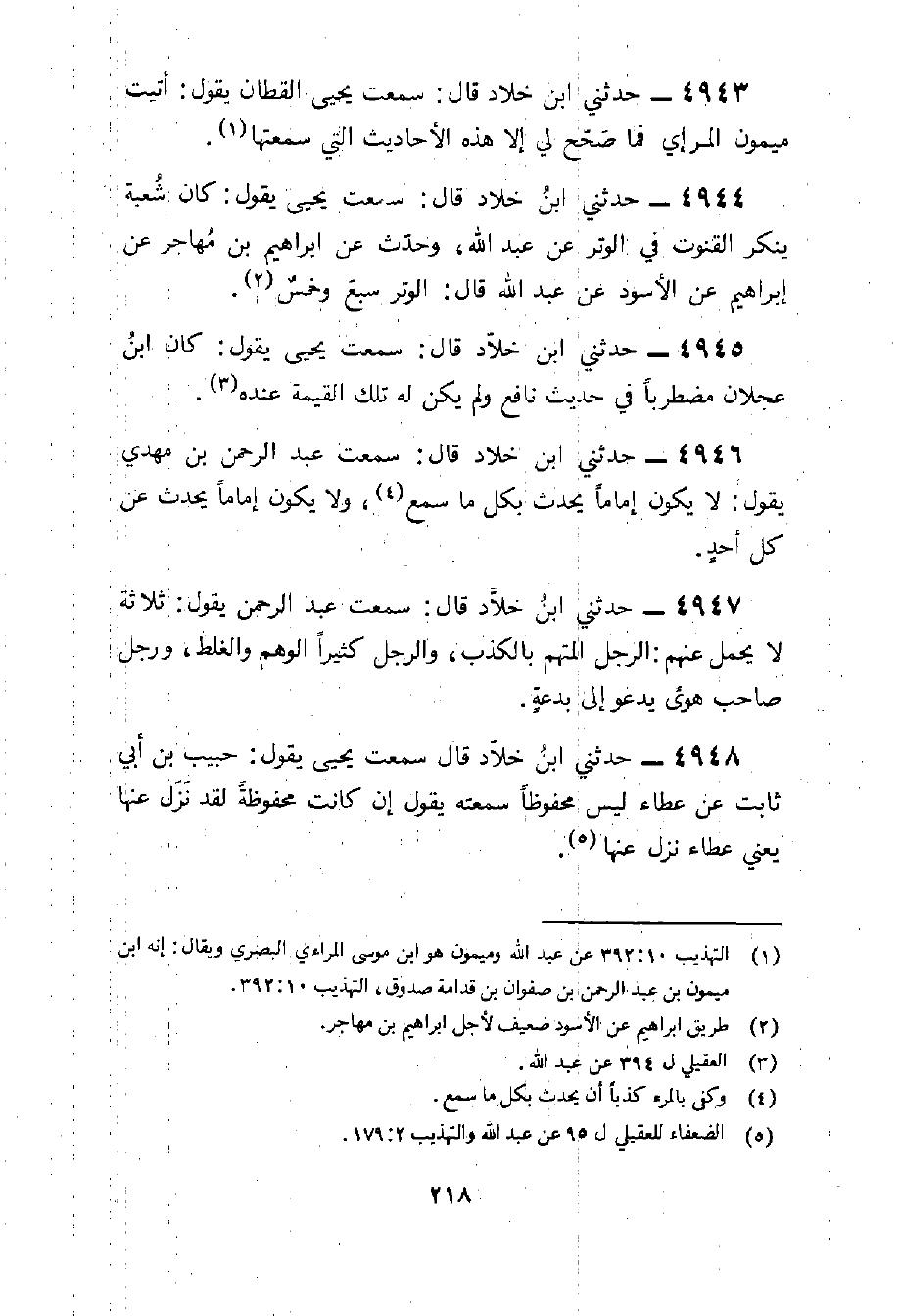 4943 - حَدثنِي بْن خَلاد قَالَ سَمِعت يحيى الْقطَّان يَقُول أتيت مَيْمُون المرأي فَمَا صحّح لي إِلَّا هَذِه الْأَحَادِيث الَّتِي سَمعتهَا