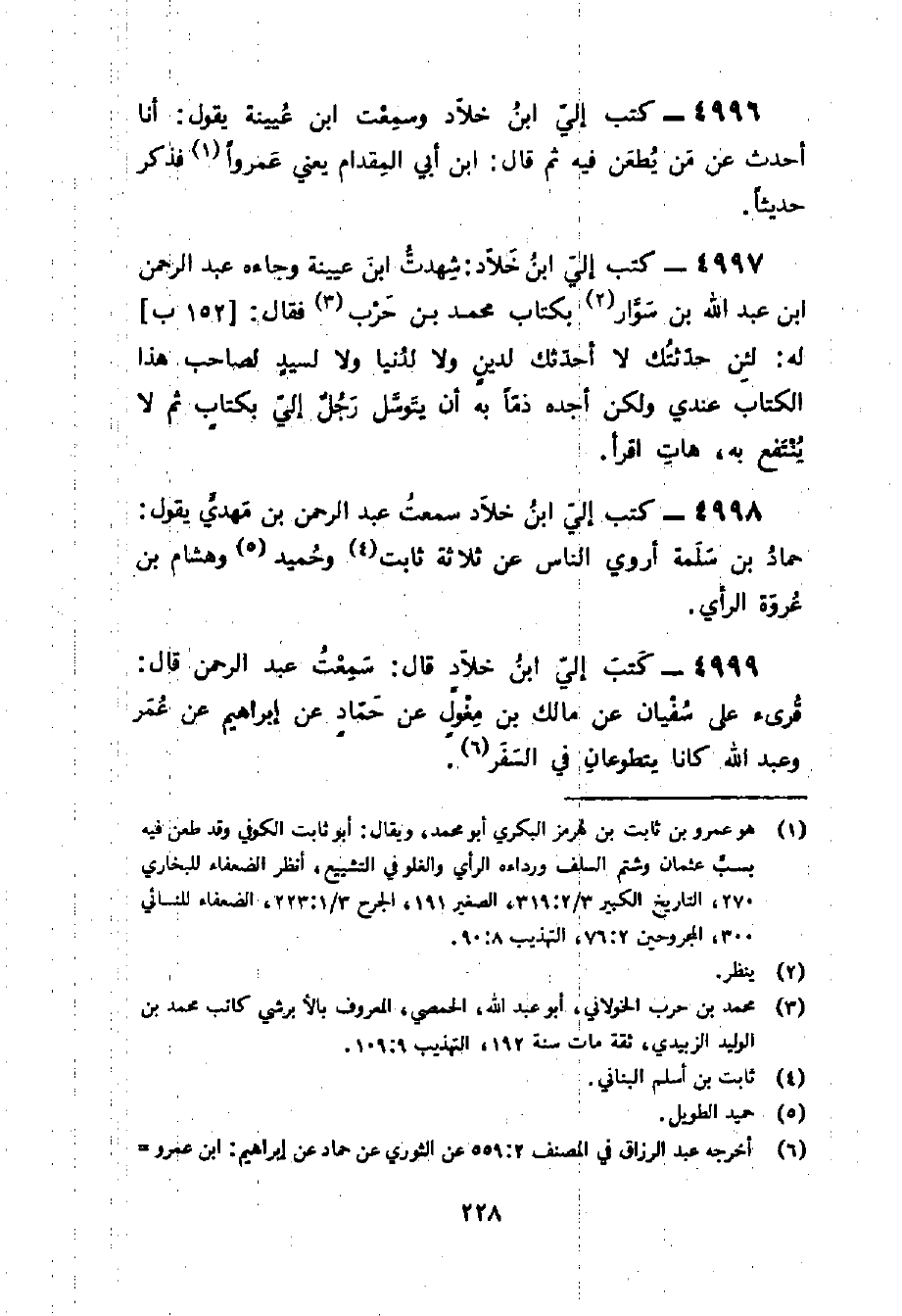 4997 - كتب إِلَيّ بن خَلاد شهِدت بن عُيَيْنَة وجاءه عبد الرَّحْمَن بن عبد الله بن سوار بِكِتَاب مُحَمَّد بن حَرْب فَقَالَ لَهُ لَئِن حدثتك لَا أحَدثك لدين وَلَا لدُنْيَا وَلَا لسَيِّد لصَاحب هَذَا الْكتاب عِنْدِي وَلَكِن أَجِدهُ ذما بِهِ أَن يتوسل رجل إِلَيّ بِكِتَاب ثمَّ لَا ينْتَفع بِهِ هَات اقْرَأ