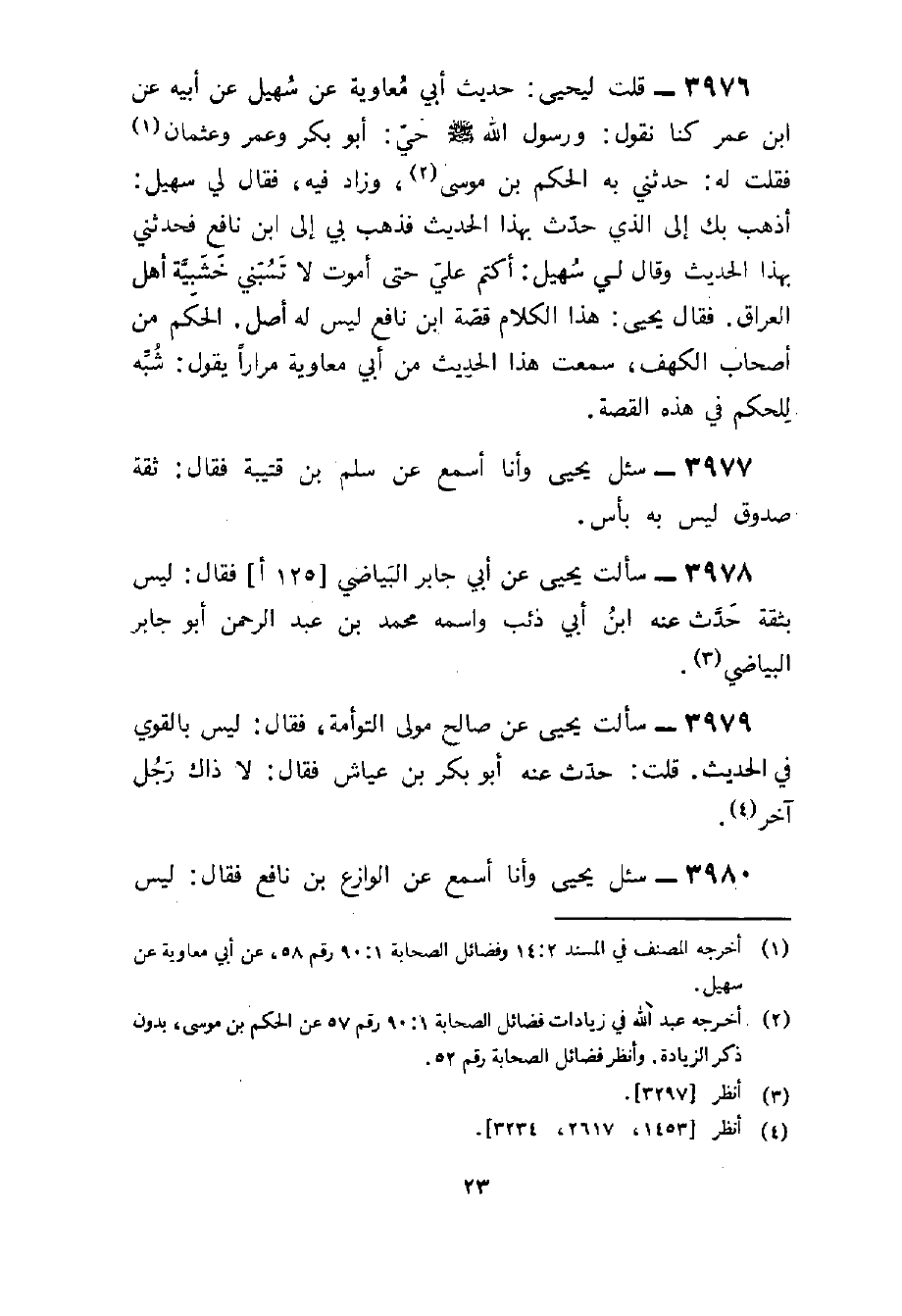 3976 - قلت ليحيى حَدِيث أبي مُعَاوِيَة عَن سُهَيْل عَن أَبِيه عَن بن عمر كُنَّا نقُول وَرَسُول الله صلى الله عَلَيْهِ وَسلم حَيّ أَبُو بكر وَعمر وَعُثْمَان فَقلت لَهُ حَدثنِي بِهِ الحكم بن مُوسَى وَزَاد فِيهِ فَقَالَ لي سُهَيْل أذهب بك إِلَى الَّذِي حدث بِهَذَا الحَدِيث فَذهب بِي إِلَى بن نَافِع فَحَدثني بِهَذَا الحَدِيث وَقَالَ لي سُهَيْل اكتم عَليّ حَتَّى أَمُوت لَا تسبني خشبية أهل الْعرَاق فَقَالَ يحيى هَذَا الْكَلَام قصَّة بن نَافِع لَيْسَ لَهُ أصل الحكم من أَصْحَاب الْكَهْف سَمِعت هَذَا الحَدِيث من أبي مُعَاوِيَة مرَارًا يَقُول شبه للْحكم فِي هَذِه الْقِصَّة