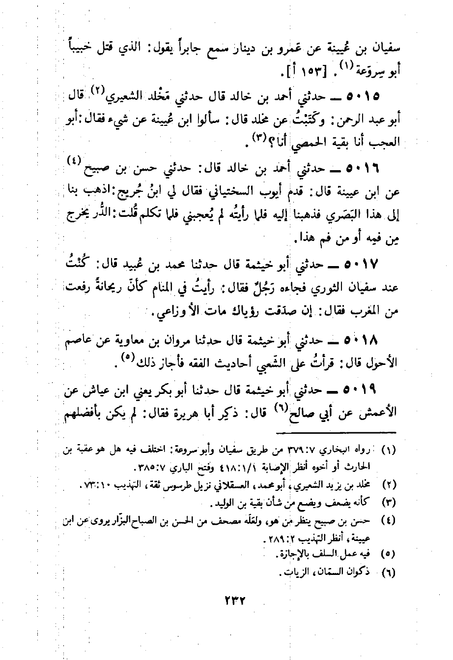 5015 - حَدثنِي أَحْمد بن خَالِد قَالَ حَدثنِي مخلد الشعيري قَالَ أَبُو عبد الرَّحْمَن وكتبت عَن مخلد قَالَ سَأَلُوا بن عُيَيْنَة عَن شَيْء فَقَالَ أَبُو الْعجب أَنا بَقِيَّة الْحِمصِي أَنا