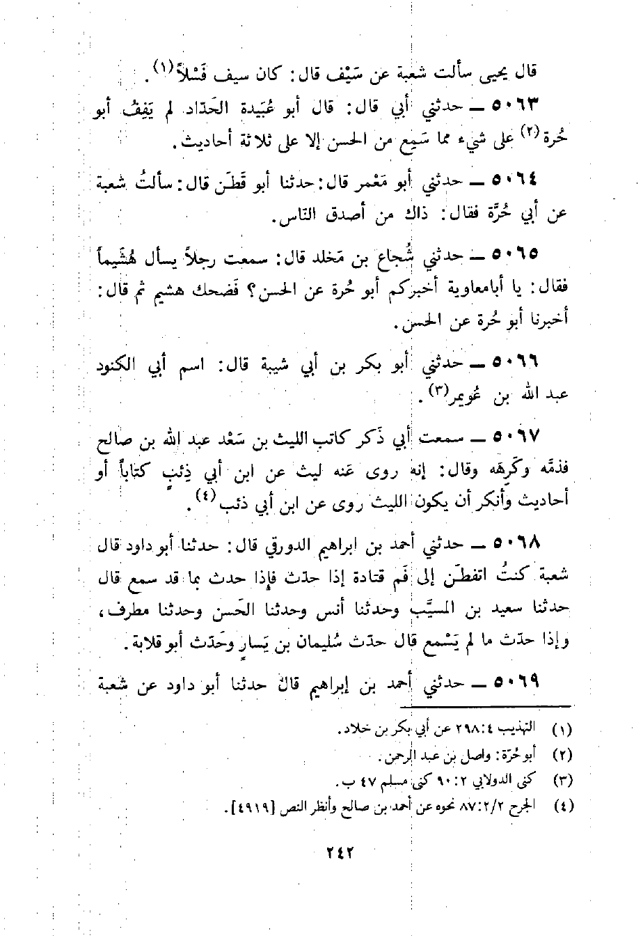 5065 - حَدثنِي شُجَاع بن مخلد قَالَ سَمِعت رجلا يسْأَل هشيما فَقَالَ يَا أَبَا مُعَاوِيَة أخْبركُم أَبُو حرَّة عَن الْحسن فَضَحِك هشيم ثمَّ قَالَ أخبرنَا أَبُو حرَّة عَن الْحسن