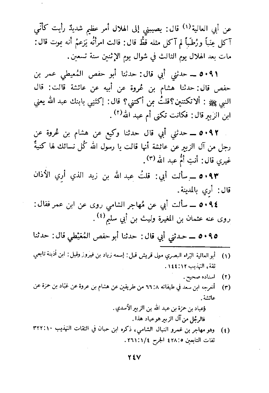 5091 - حَدثنِي أبي قَالَ حَدثنَا أَبُو حَفْصٍ الْمُعَيْطِيُّ عُمَرُ بْنُ حَفْصٍ قَالَ حَدَّثَنَا هِشَامُ بْنُ عُرْوَةَ عَنْ أَبِيهِ عَنْ عَائِشَةَ قَالَتْ قَالَ النَّبِيُّ صَلَّى اللَّهُ عَلَيْهِ وَسَلَّمَ أَلَا تَكْتَنِينَ قُلْتُ بِمن أكتني قَالَ إكتبني بابنك عبد الله يَعْنِي بن الزبير قَالَ فَكَانَت تكنى أم عبد الله