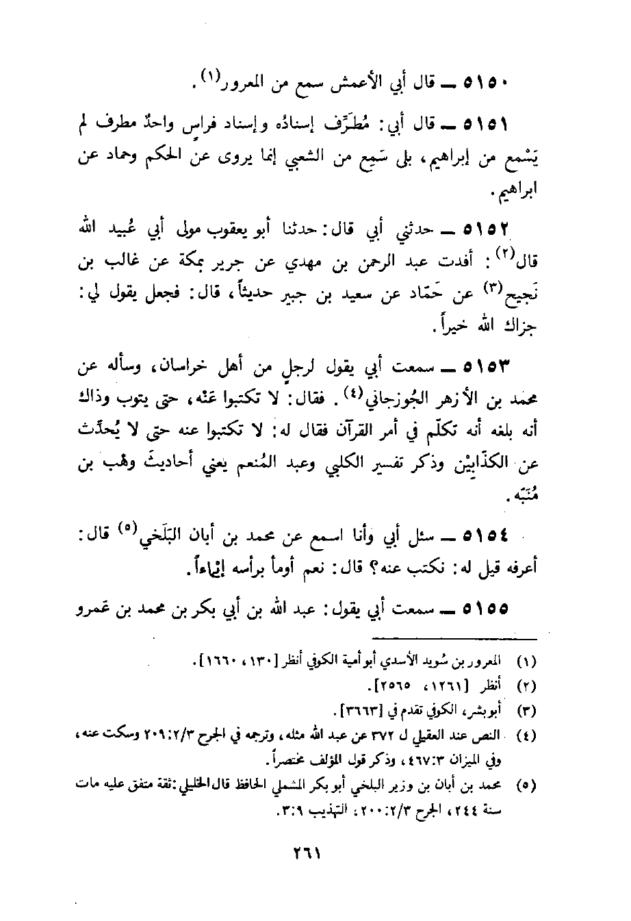 5152 - حَدثنِي أبي قَالَ حَدثنَا أَبُو يَعْقُوب مولى أبي عبيد الله قَالَ أفدت عبد الرَّحْمَن بن مهْدي عَن جرير بِمَكَّة عَن غَالب بن نجيح عَن حَمَّاد عَن سعيد بن جُبَير حَدِيثا قَالَ فَجعل يَقُول لي جَزَاك الله خيرا