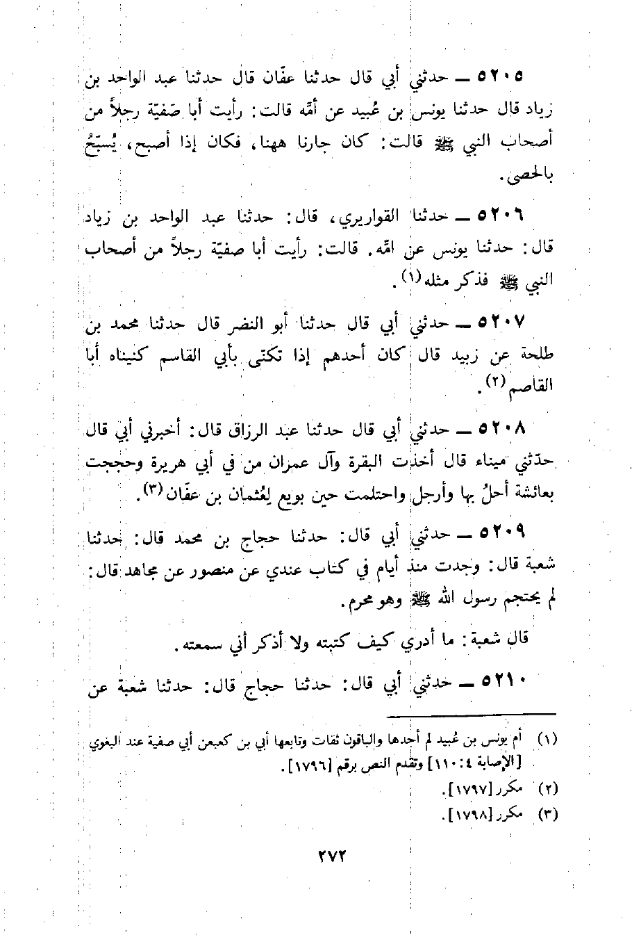 5205 - حَدثنِي أبي قَالَ حَدثنَا عَفَّان قَالَ حَدثنَا عبد الْوَاحِد بن زِيَادٍ قَالَ حَدَّثَنَا يُونُسُ بْنُ عبيد عَن أمه قَالَت رَأَيْت أَبَا صَفِيَّة رجلا من أَصْحَاب النَّبِيَّ صَلَّى اللَّهُ عَلَيْهِ وَسَلَّمَ قَالَتْ كَانَ جَارَنَا هَهُنَا فَكَانَ إِذَا أَصْبَحَ يُسَبِّحُ بِالْحَصَى