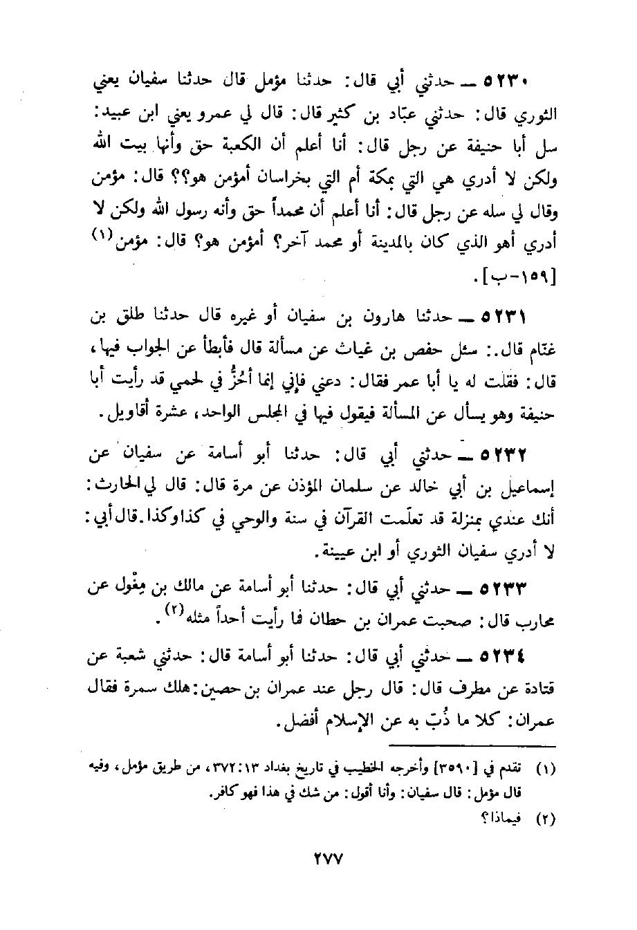 5230 - حَدثنِي أبي قَالَ حَدثنَا مُؤَمل قَالَ حَدثنَا سُفْيَان يَعْنِي الثَّوْريّ قَالَ حَدثنِي عباد بن كثير قَالَ قَالَ لي عَمْرو يَعْنِي بن عبيد سل أَبَا حنيفَة عَن رجل قَالَ أَنا أعلم أَن الْكَعْبَة حق وَأَنَّهَا بَيت الله وَلَكِن لَا أَدْرِي هِيَ الَّتِي بِمَكَّة أم الَّتِي بخراسان أمؤمن هُوَ قَالَ مُؤمن وَقَالَ لي سَله عَن رجل قَالَ أَنا أعلم أَن مُحَمَّدًا حق وَأَنه رَسُول الله وَلَكِن لَا أَدْرِي أهوَ الَّذِي كَانَ بِالْمَدِينَةِ أَو مُحَمَّد آخر أمؤمن هُوَ قَالَ مُؤمن