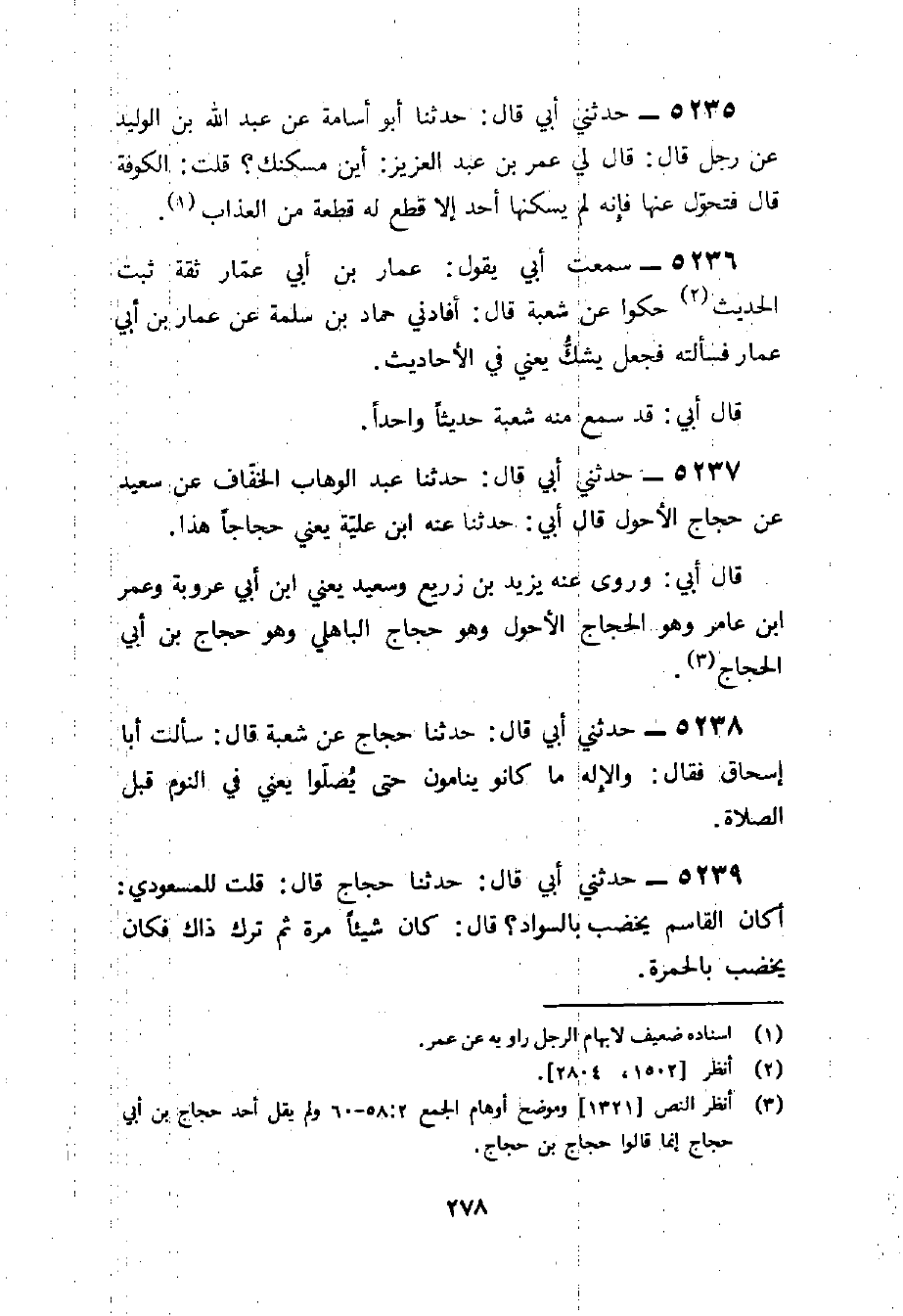 5239 - حَدثنِي أبي قَالَ حَدثنَا حجاج قَالَ قلت للمسعودي أَكَانَ الْقَاسِم يخضب بِالسَّوَادِ قَالَ كَانَ شَيْئا مرّة ثمَّ ترك ذَاك فَكَانَ يَخْضِبُ بِالْحُمْرَةِ