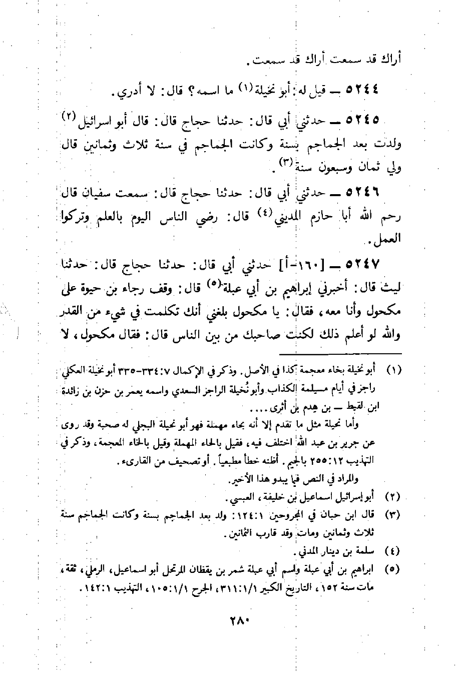 5245 - حَدثنِي أبي قَالَ حَدثنَا حجاج قَالَ قَالَ أَبُو إِسْرَائِيل ولدت بعد الجماجم بِسنة وَكَانَت الجماجم فِي سنة ثَلَاث وَثَمَانِينَ قَالَ ولي ثَمَان وَسَبْعُونَ سنة