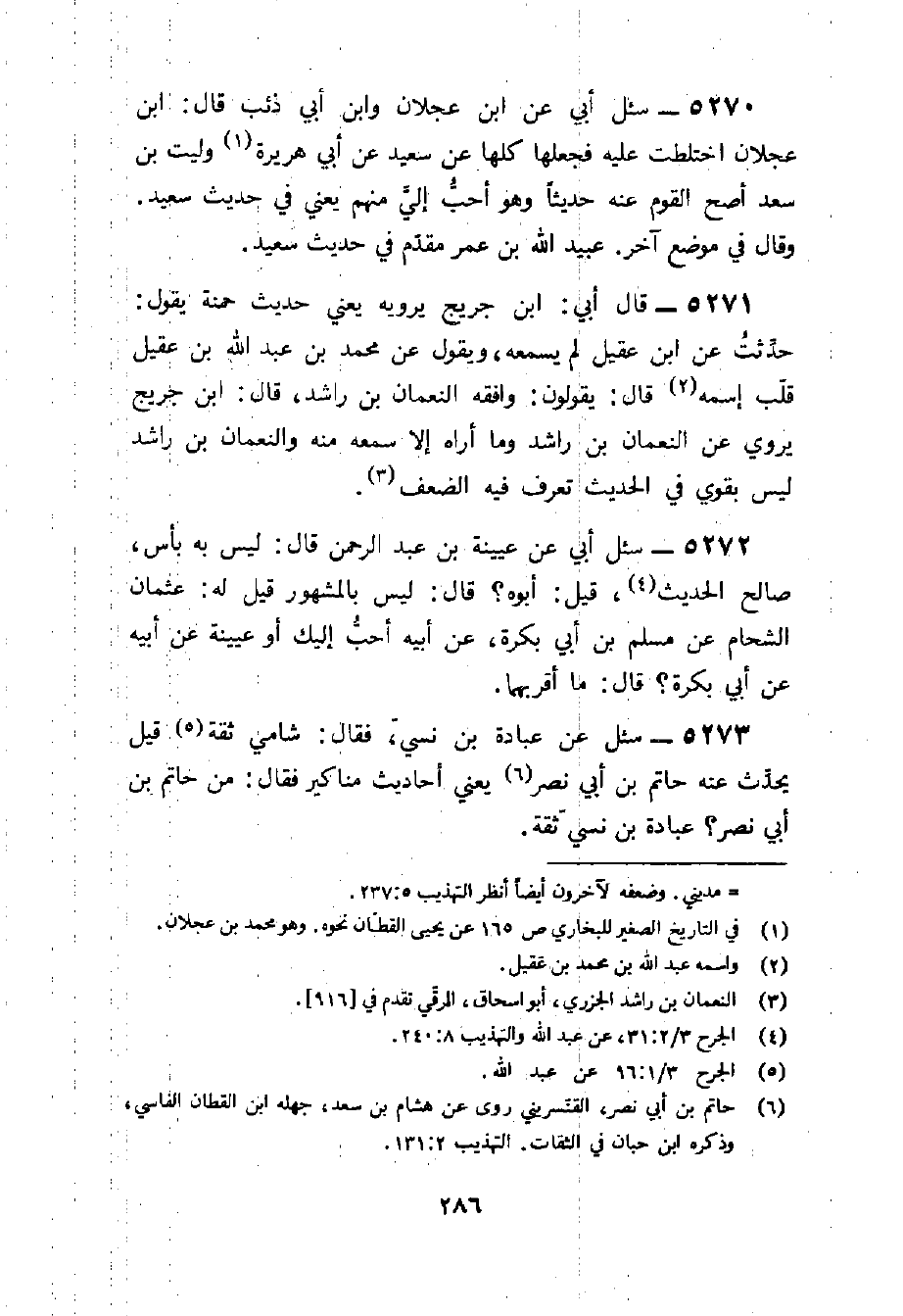5273 - سُئِلَ عَن عبَادَة بن نسي فَقَالَ شَامي ثِقَة قيل يحدث عَنهُ حَاتِم بن أبي نصر يَعْنِي أَحَادِيث مَنَاكِير فَقَالَ من حَاتِم بن أبي نصر عبَادَة بن نسي ثِقَة