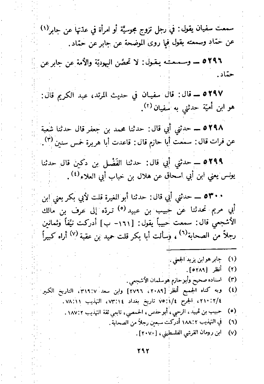 5300 - حَدَّثَنِي أبي قَالَ حَدثنَا أَبُو الْمُغيرَة قلت لأبي بكر يَعْنِي بن أبي مَرْيَم تحدثنا عَن حبيب بن عبيد ترده إِلَى عرف بن مَالك الْأَشْجَعِيّ قَالَ سَمِعت حبيبًا يَقُول أدْركْت نيفًا وَثَمَانِينَ رجلا من الصَّحَابَة وَسَأَلت أَبَا بَكْر قلت حميد بْن عقبَة أرَاهُ كَبِيرا وَأَنت تحدث عَنْهُ عَن أَبِي الدَّرْدَاء قَالَ حَدَّثَنِي أَن كل شَيْء حَدَّثَنِي بِهِ عَن أَبِي الدَّرْدَاء سَمعه من أَبِي الدَّرْدَاء