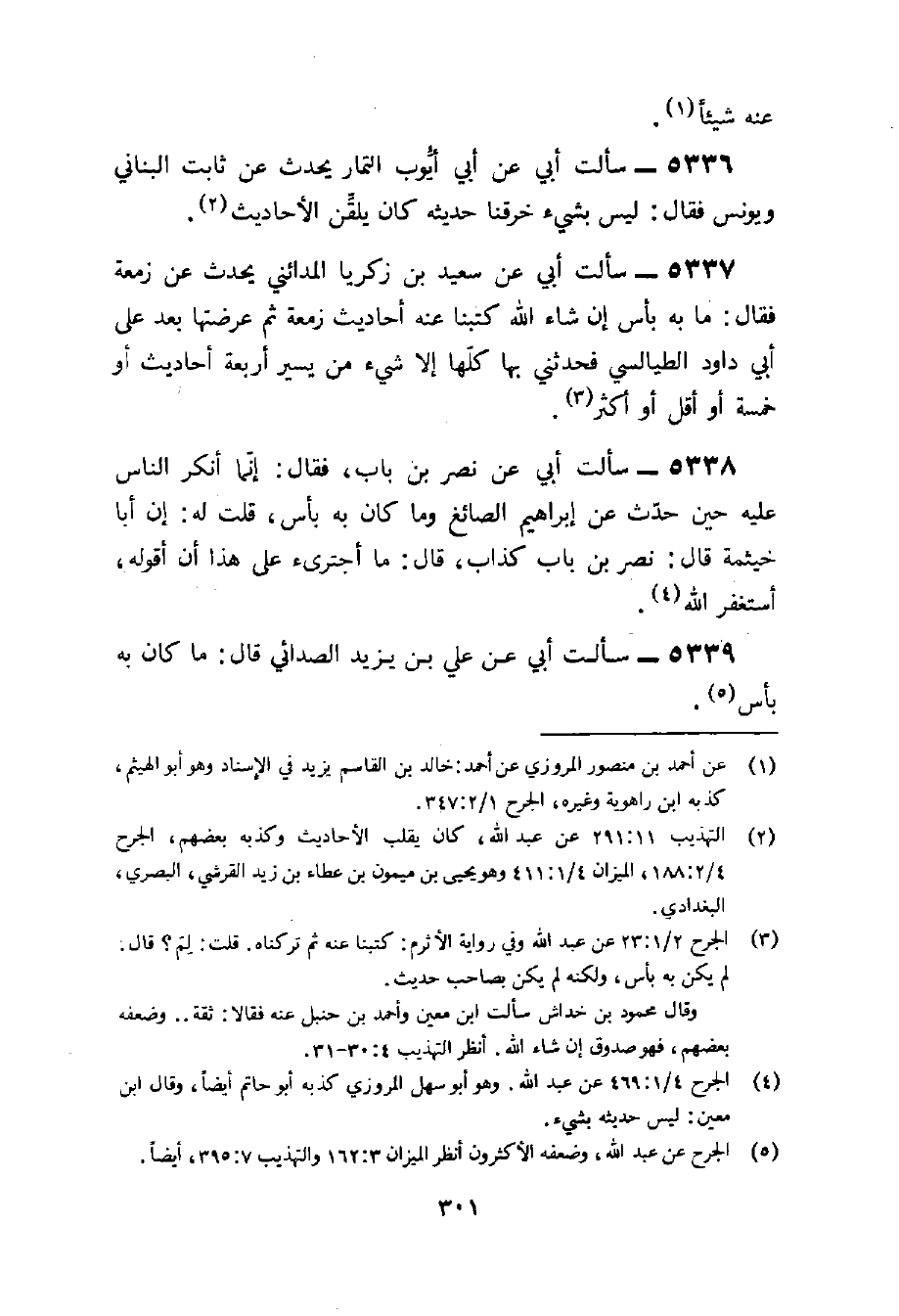 5337 - سَأَلت أبي عَن سعيد بن زَكَرِيَّا الْمَدَائِنِي يحدث عَن زَمعَة فَقَالَ مَا بِهِ بَأْس إِن شَاءَ الله كتبنَا عَنهُ أَحَادِيث زَمعَة ثمَّ عرضتها بعد على أبي دَاوُد الطَّيَالِسِيّ فَحَدثني بهَا كلهَا إِلَّا شَيْء من يسير أَرْبَعَة أَحَادِيث أَو خَمْسَة أَو أقل أَو أَكثر