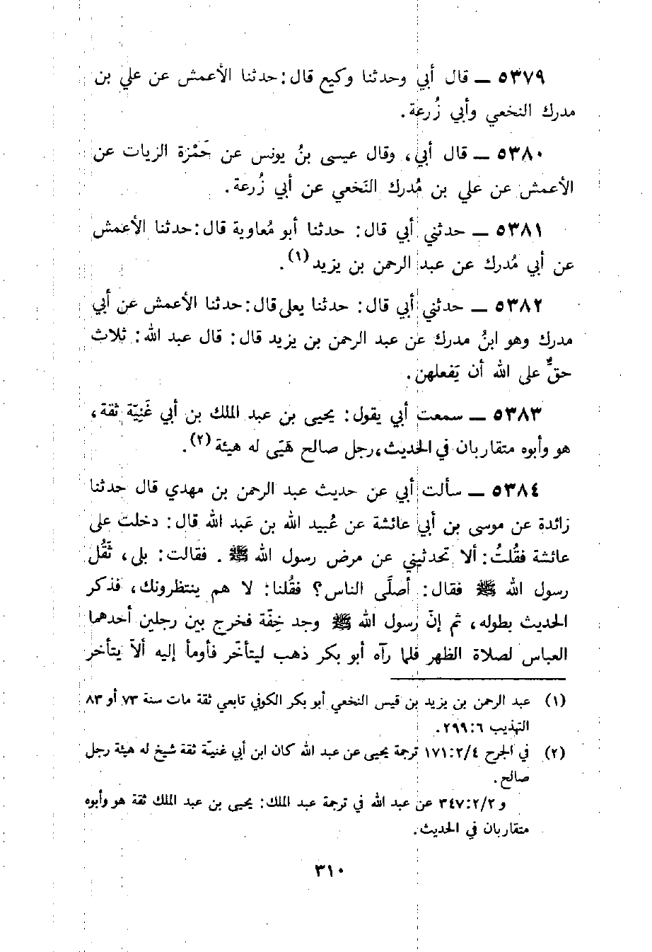 5381 - حَدثنِي أبي قَالَ حَدثنَا أَبُو مُعَاوِيَة قَالَ حَدَّثَنَا الْأَعْمَش عَن أبي مدرك عَن عبد الرَّحْمَن بْن يزِيد
