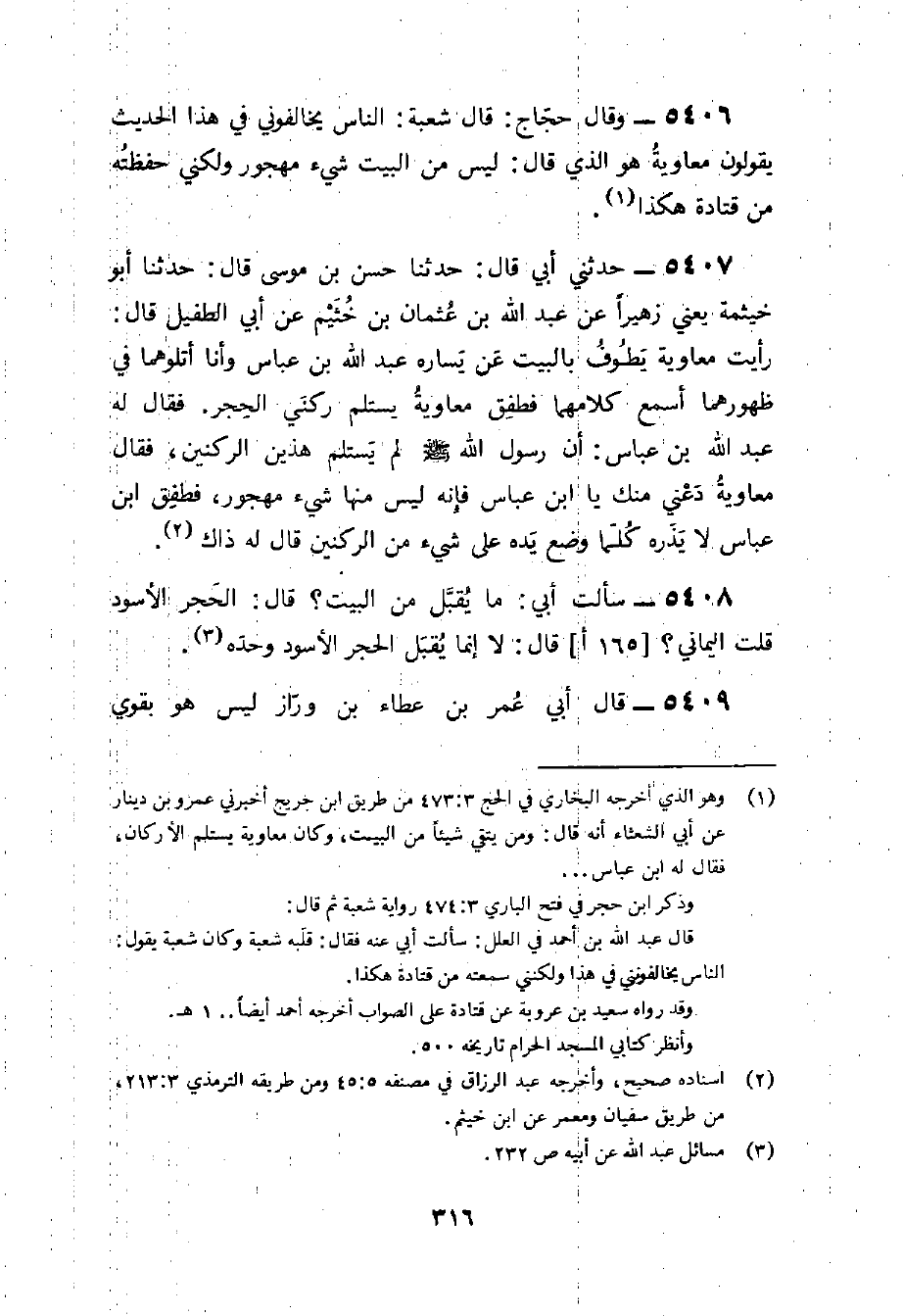 5407 - حَدَّثَنِي أبي قَالَ حَدثنَا حسن بن مُوسَى قَالَ حَدَّثَنَا أَبُو خَيْثَمَةَ يَعْنِي زُهَيْرًا عَنْ عَبْدِ اللَّهِ بْنِ عُثْمَانَ بْنِ خُثَيْمٍ عَنْ أَبِي الطُّفَيْلِ قَالَ رَأَيْتُ مُعَاوِيَةَ يَطُوفُ بِالْبَيْتِ عَنْ يَسَارِهِ عَبْدُ اللَّهِ بْنُ عَبَّاسٍ وَأَنَا أَتْلُوهُمَا فِي ظُهُورِهِمَا أَسْمَعُ كَلَامَهُمَا فَطَفِقَ مُعَاوِيَةُ يَسْتَلِمُ رُكْنَيِ الْحَجَرِ فَقَالَ لَهُ عَبْدُ اللَّهِ بْنُ عَبَّاسٍ أَنّ رَسُولَ اللَّهِ صَلَّى اللَّهُ عَلَيْهِ وَسَلَّمَ لَمْ يَسْتَلِمْ هَذَيْنِ الرُّكْنَيْنِ فَقَالَ مُعَاوِيَةُ دَعْنِي مِنْكَ يَا بن عَبَّاسٍ فَإِنَّهُ لَيْسَ مِنْهَا شَيْءٌ مهجور فَطَفِقَ بن عَبَّاسٍ لَا يَذَرَهُ كُلَّمَا وَضَعَ يَدَهُ عَلَى شَيْءٍ مِنَ الرُّكْنَيْنِ قَالَ لَهُ ذَاكَ