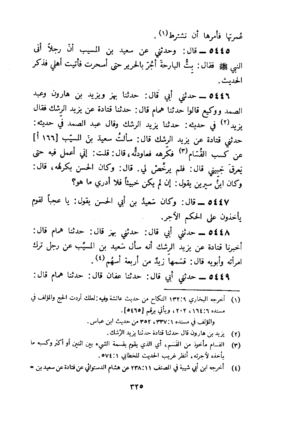 5446 - حَدَّثَنِي أَبِي قَالَ حَدَّثَنَا بَهْزٌ وَيزِيد بن هَارُون وَعبد الصَّمد ووكيع قَالُوا حَدثنَا همام قَالَ حَدثنَا قَتَادَة عَن يزِيد الرشك فَقَالَ يزِيد فِي حَدِيثه حَدثنَا يزِيد الرشك وَقَالَ عبد الصَّمد فِي حَدِيثه حَدثنِي قَتَادَة عَن يزِيد الرشك قَالَ سَأَلت سعيد بن الْمسيب عَن كسب القسام فكرهه فعاودته قَالَ قلت إِنِّي أعمل فِيهِ حَتَّى يعرق جبيني قَالَ فَلم يرخص لي قَالَ وَكَانَ الْحسن يكرههُ قَالَ وَكَانَ بن سِيرِين يَقُول إِن لم يكن خبيثا فَلَا أَدْرِي مَا هُوَ