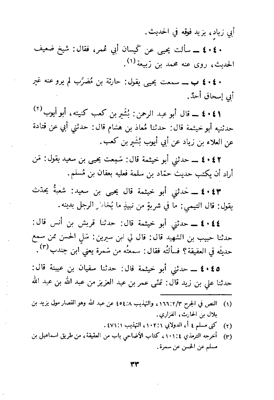 4040 - سَأَلت يحيى عَن كيسَان أبي عمر فَقَالَ شيخ ضَعِيف الحَدِيث روى عَنهُ مُحَمَّد بن ربيعَة سَمِعت يحيى يَقُول حَارِثَة بن مضرب لم يرو عَنهُ غير أبي إِسْحَاق أحد
