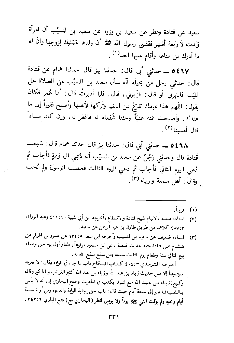 5468 - حَدثنِي أبي قَالَ حَدَّثَنَا بَهْزٌ قَالَ حَدَّثَنَا هَمَّامٌ قَالَ سَمِعت قَتَادَة قَالَ وحَدثني رجل عَن سعيد بن الْمسيب أَنه دعِي إِلَى وَلِيمَة فَأجَاب ثمَّ دعِي الْيَوْم الثَّانِي فَأجَاب ثمَّ دعِي الْيَوْم الثَّالِث فحصب الرَّسُول وَلم يحب وَقَالَ أهل سمعة ورياء