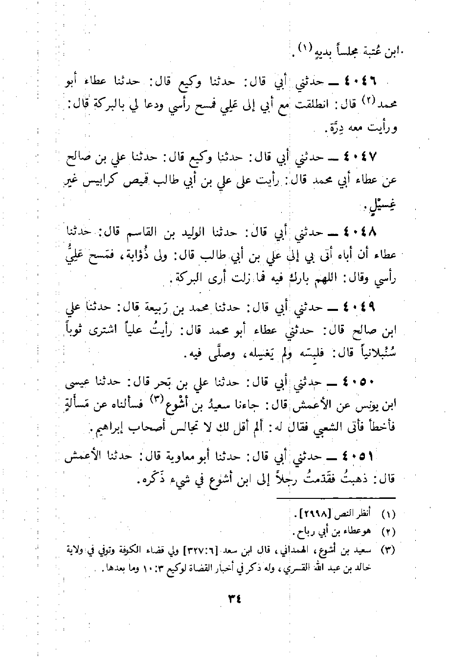4047 - حَدَّثَنِي أَبِي قَالَ حَدَّثَنَا وَكِيعٌ قَالَ حَدَّثَنَا عَلِيُّ بْنُ صَالِحٍ عَنْ عَطَاءٍ أَبِي مُحَمَّدٍ قَالَ رَأَيْتُ عَلَى عَلِيِّ بْنِ أَبِي طَالِبٍ قَمِيصَ كَرَابِيسَ غَيْرَ غَسِيلٍ