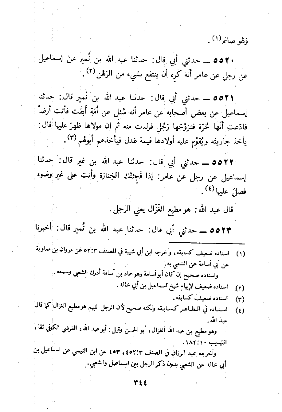5522 - حَدثنِي أبي قَالَ حَدثنَا عبد الله بن نمير قَالَ حَدَّثَنَا إِسْمَاعِيلُ عَنْ رَجُلٍ عَنْ عَامر إِذا فجئتك الْجِنَازَة وَأَنت على غير وضوء فصل عَلَيْهَا قَالَ عبد الله هُوَ مُطِيع الغزال يَعْنِي الرجل