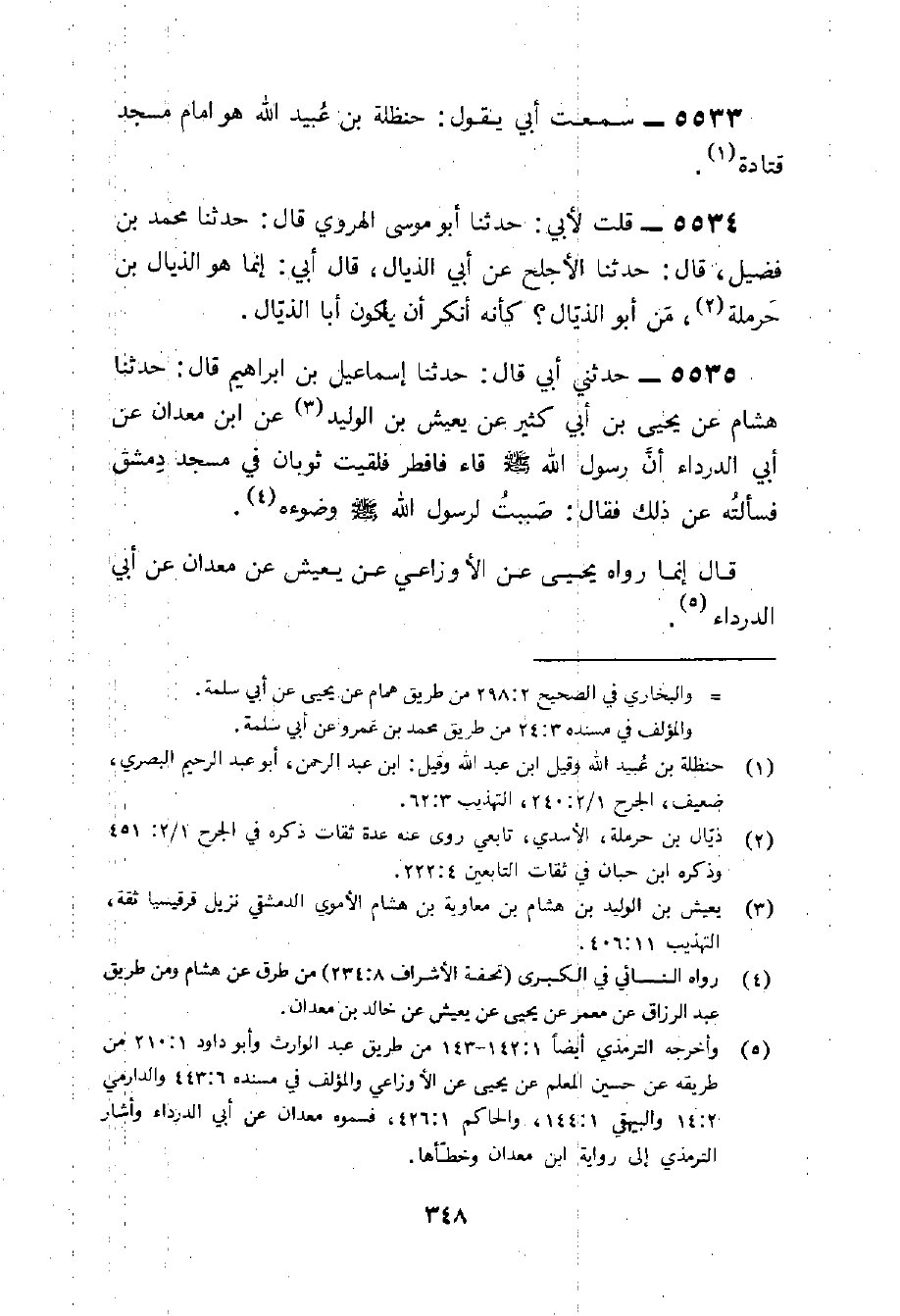 5535 - حَدَّثَنِي أَبِي قَالَ حَدثنَا إِسْمَاعِيل بن إِبْرَاهِيم قَالَ حَدَّثَنَا هِشَامٌ عَنْ يَحْيَى بْنِ أَبِي كَثِيرٍ عَنْ يَعِيشَ بن الْوَلِيد عَن بن مَعْدَانَ عَنْ أَبِي الدَّرْدَاءِ أَنّ رَسُولَ اللَّهِ صَلَّى اللَّهُ عَلَيْهِ وَسَلَّمَ قَاءَ فَأَفْطَرَ فَلَقِيتُ ثَوْبَانَ فِي مَسْجِدِ دِمَشْقَ فَسَأَلْتُهُ عَنْ ذَلِكَ فَقَالَ صَبَبْتُ لِرَسُولِ اللَّهِ صَلَّى اللَّهُ عَلَيْهِ وَسَلَّمَ وُضَوءَهُ قَالَ إِنَّمَا رَوَاهُ يَحْيَى عَنِ الْأَوْزَاعِيِّ عَنْ يَعِيشَ عَنْ مَعْدَانَ عَنْ أَبِي الدَّرْدَاءِ
